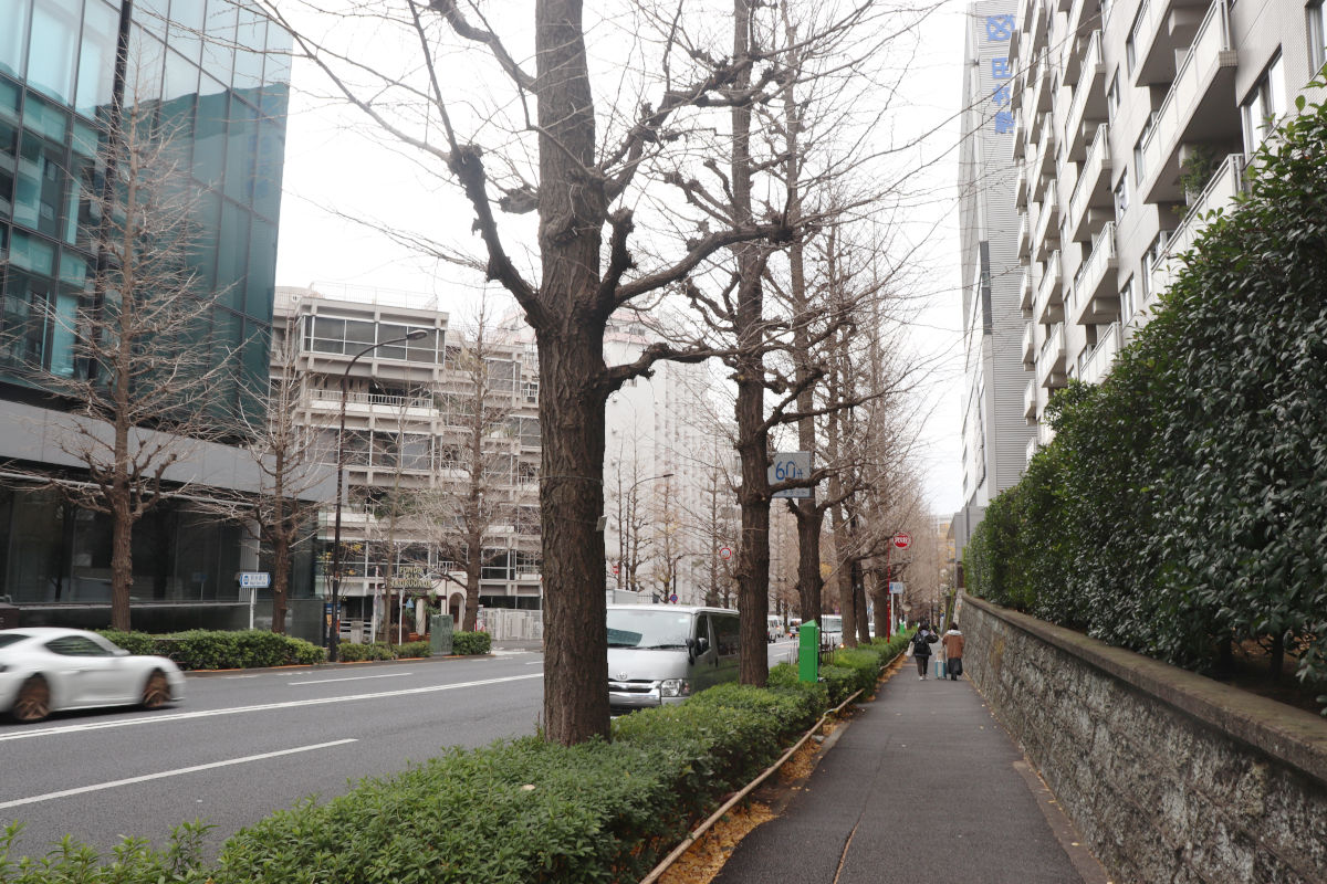 都市計画道路内は建築制限が掛けられるため、ビル本体とは別構造で低層となっていたり、前庭部分としているところも多いです。