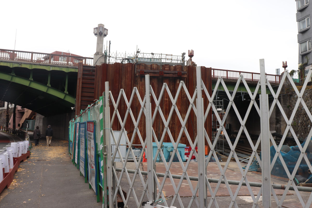 立坑建設のため、千登世橋から明治通りに降りる南側の階段が撤去されています。