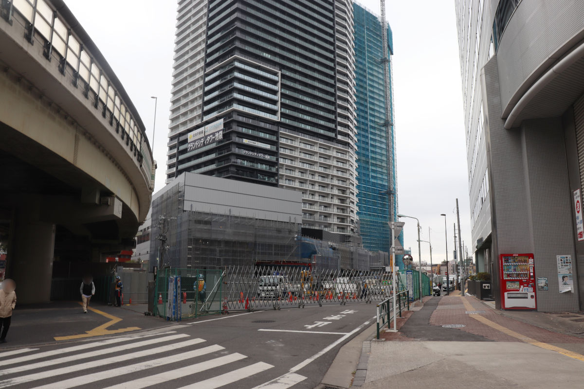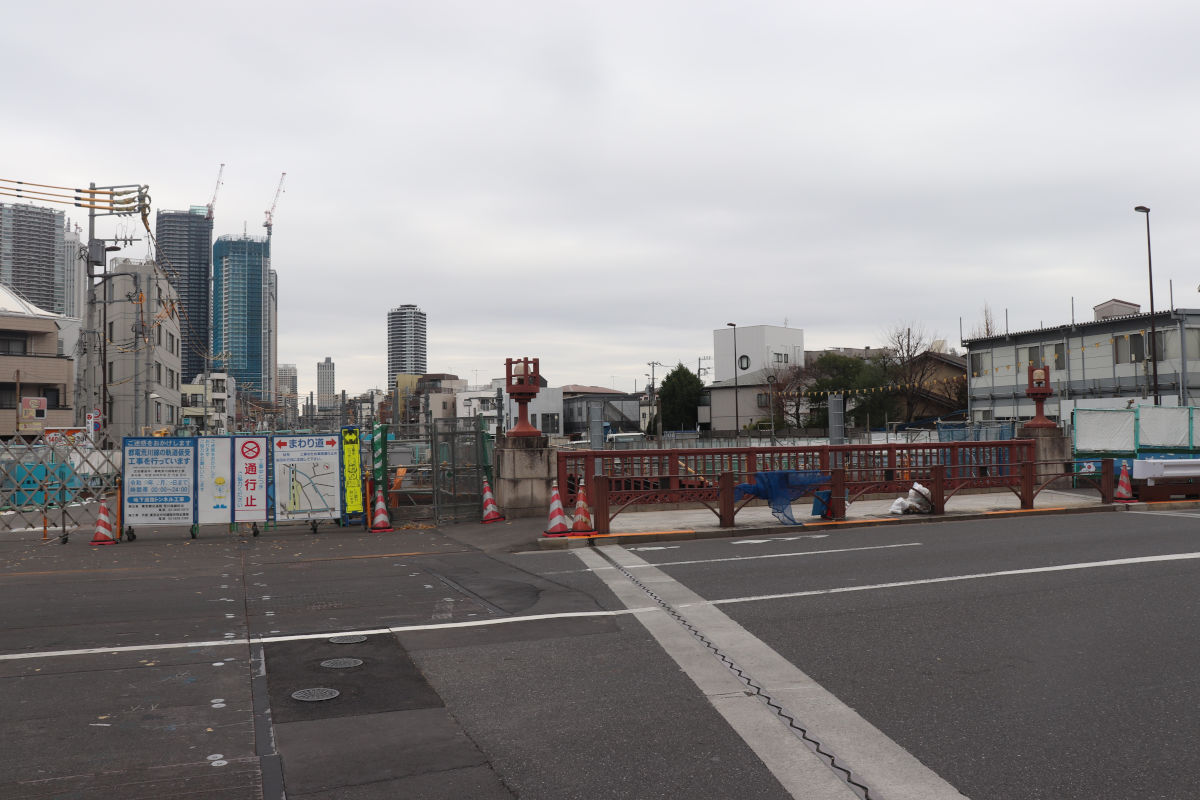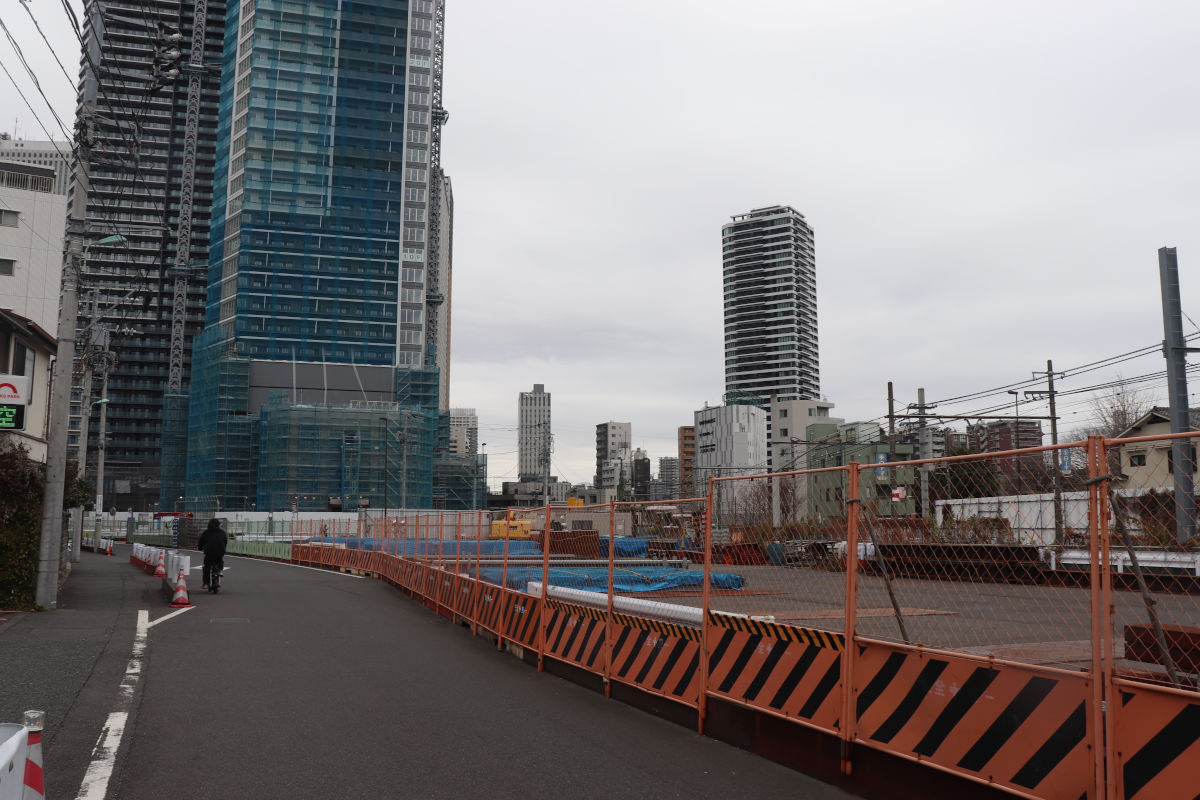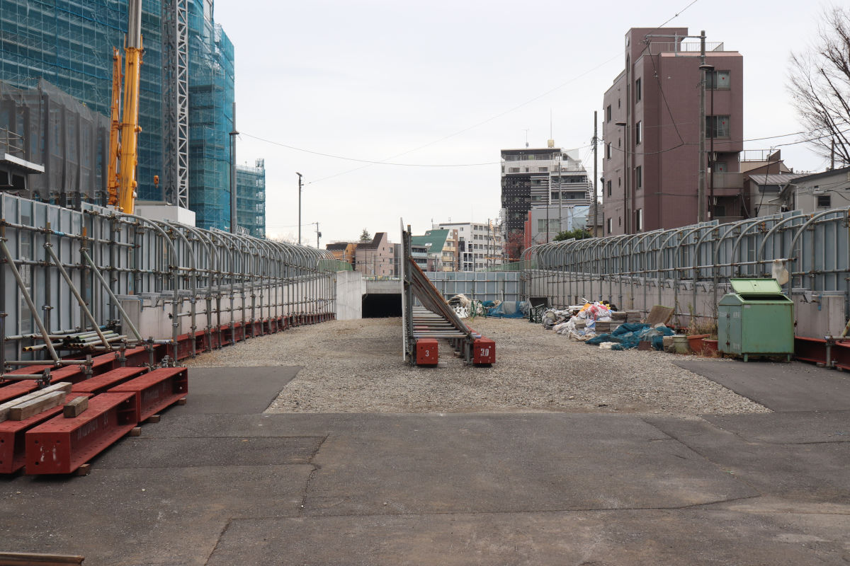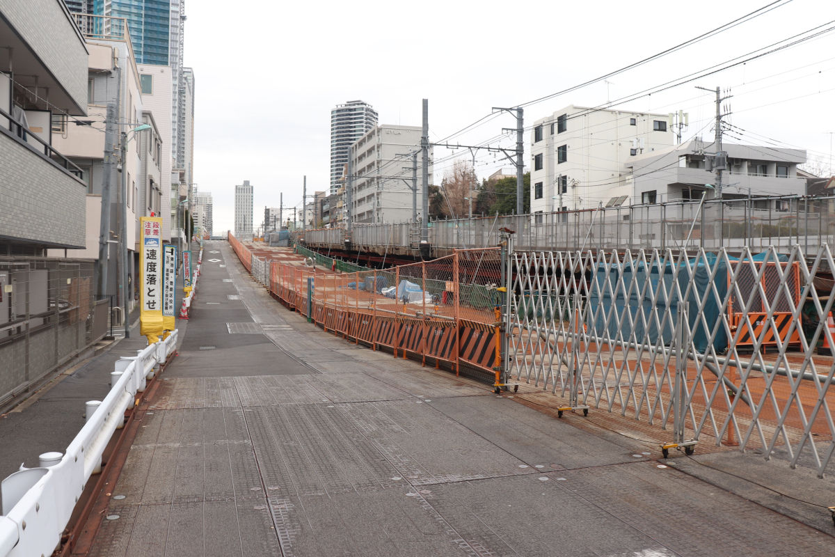 トンネル躯体工事は既に完了している模様ですが、引き続き、覆工板となっている箇所があるほか、都電は仮軌道が続いています。