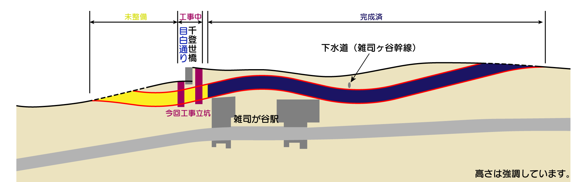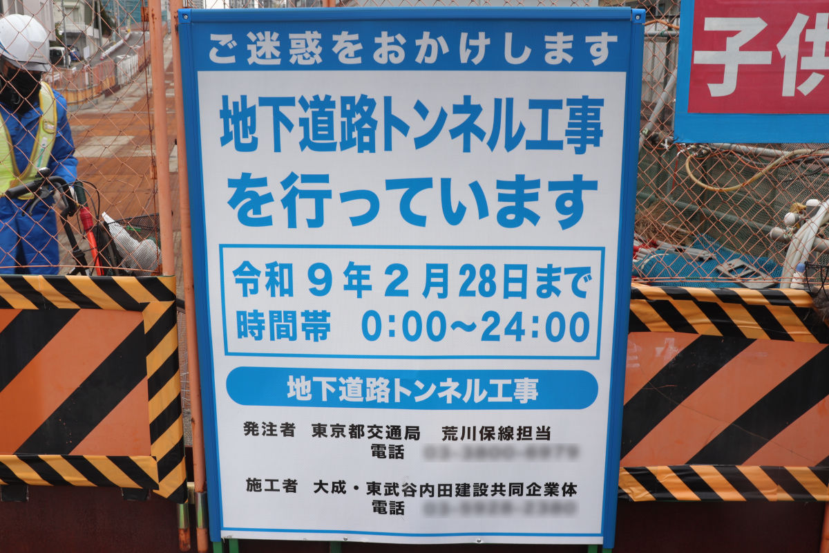 地下部の道路は開削方式により建設が行われていますが、地下には東京メトロ副都心線、地上には東京さくらトラム(都電荒川線)が走っており、また下水道もあるなど大規模な工事が行われています。