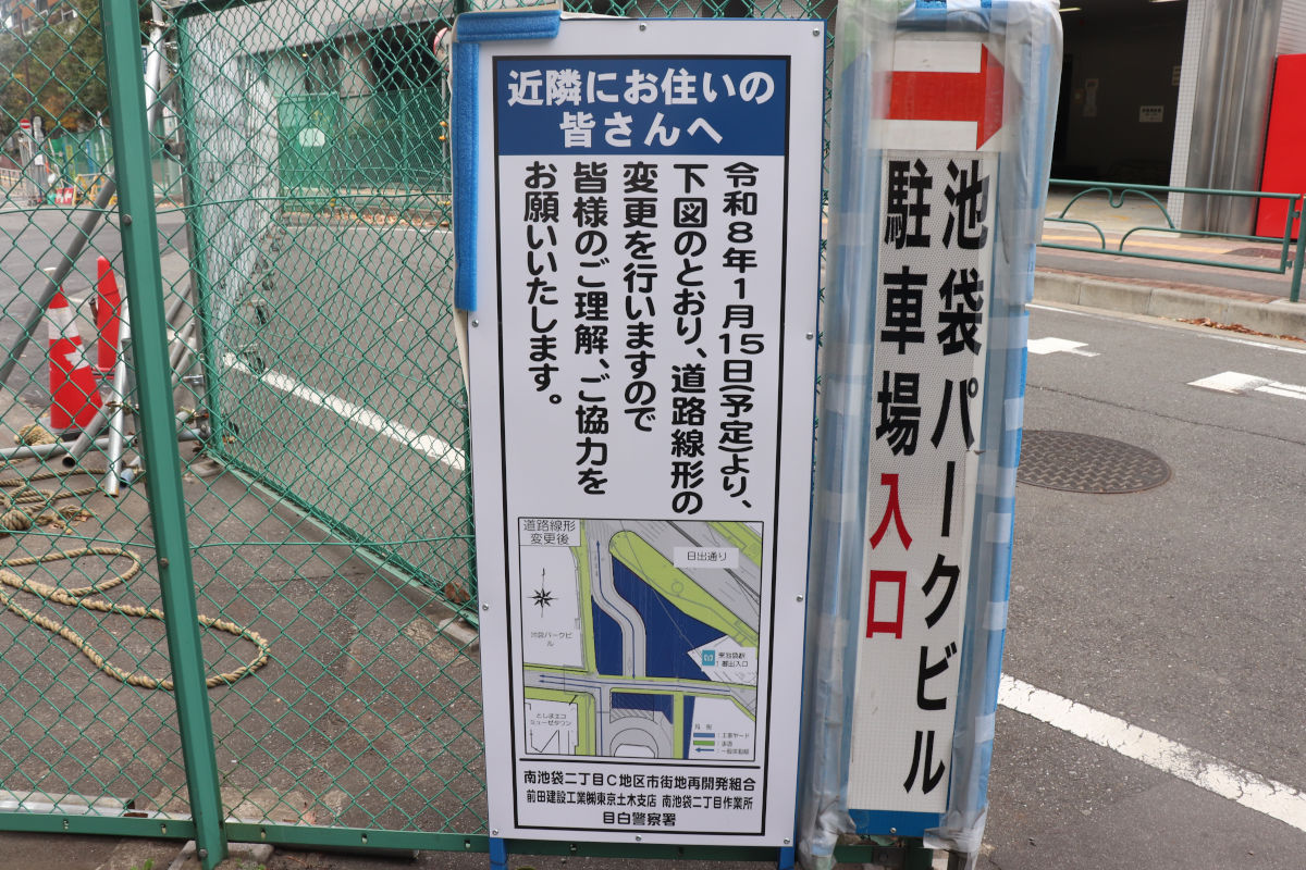 また、再開発事業により、再開発ビル街区と東京メトロ有楽町線東池袋駅を繋ぐ地下通路の建設が進められていて、一部が道路占用を伴って工事がされています。(看板)