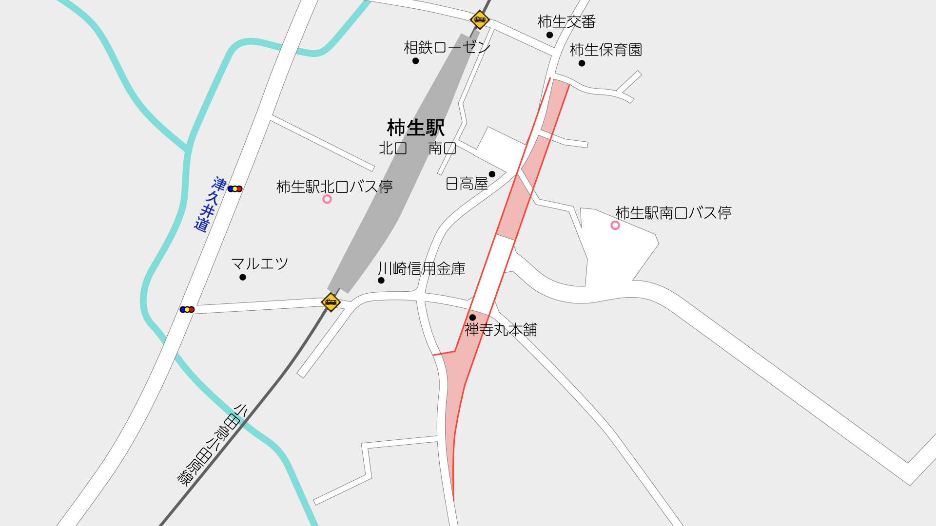 川崎3・4・20号柿生町田線のうち、柿生駅の東側では道路を新設する事業が行われています。