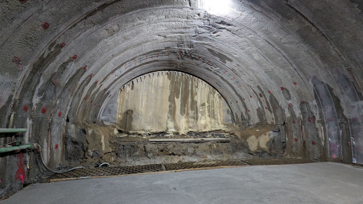 山岳トンネルは、NATM工法で建設されています。掘削中の全線にわたって吹付けコンクリート・鋼アーチ支保工建込みなどが行われている状態で、覆工コンクリートの施工はまだのようでした。