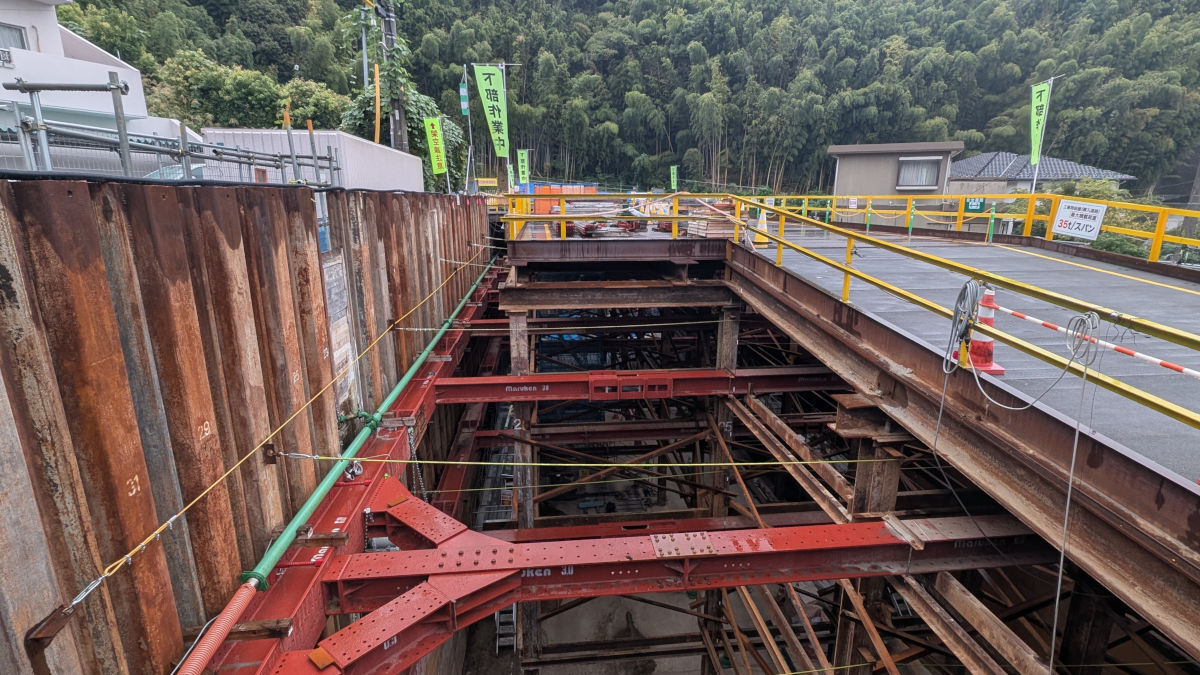 現場では既に仮設構台が設置され、掘削が行われています。覆工板があって中の様子はよく見えませんが、将来の道路面まで掘削している箇所が多いように見えました。