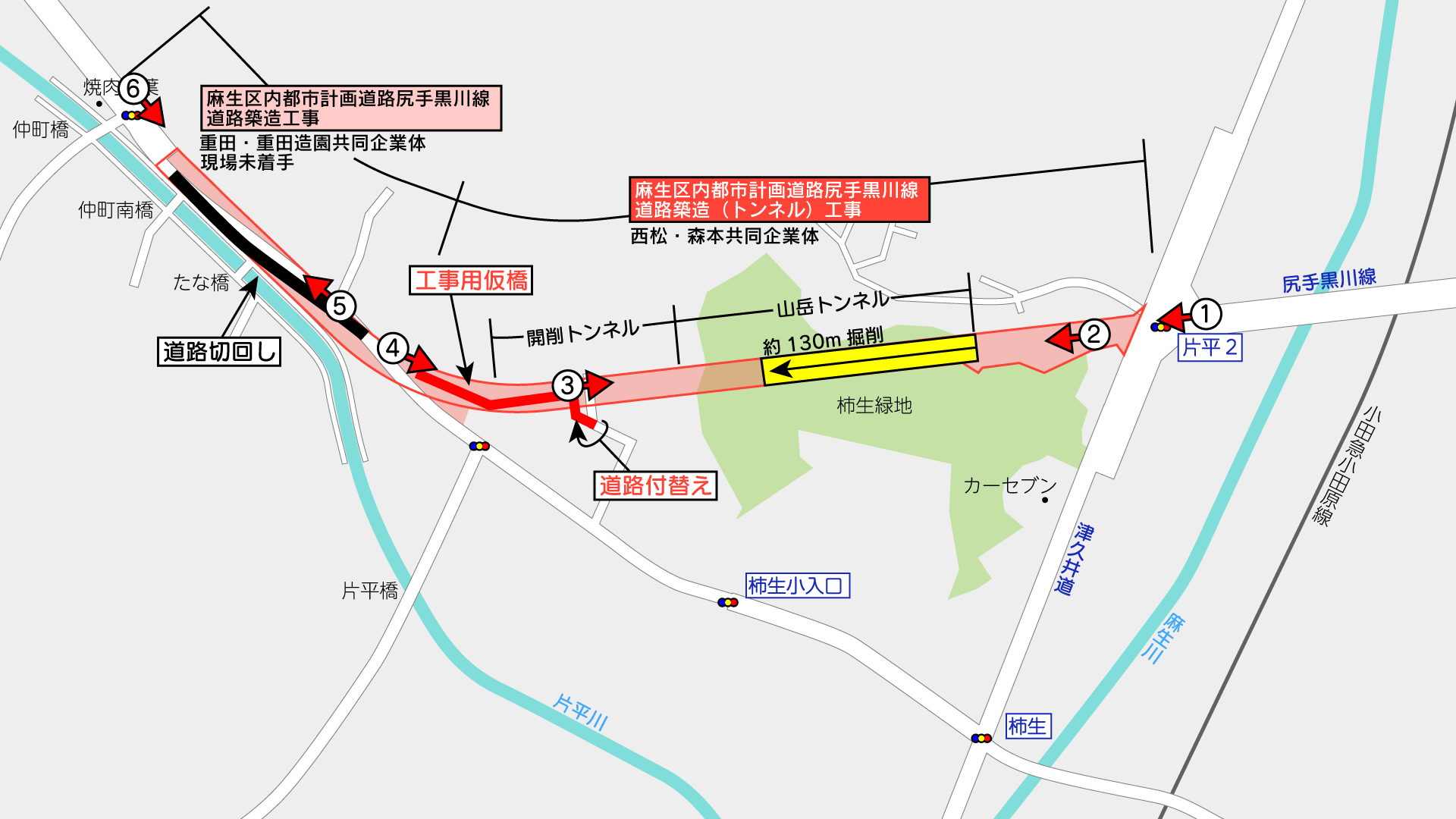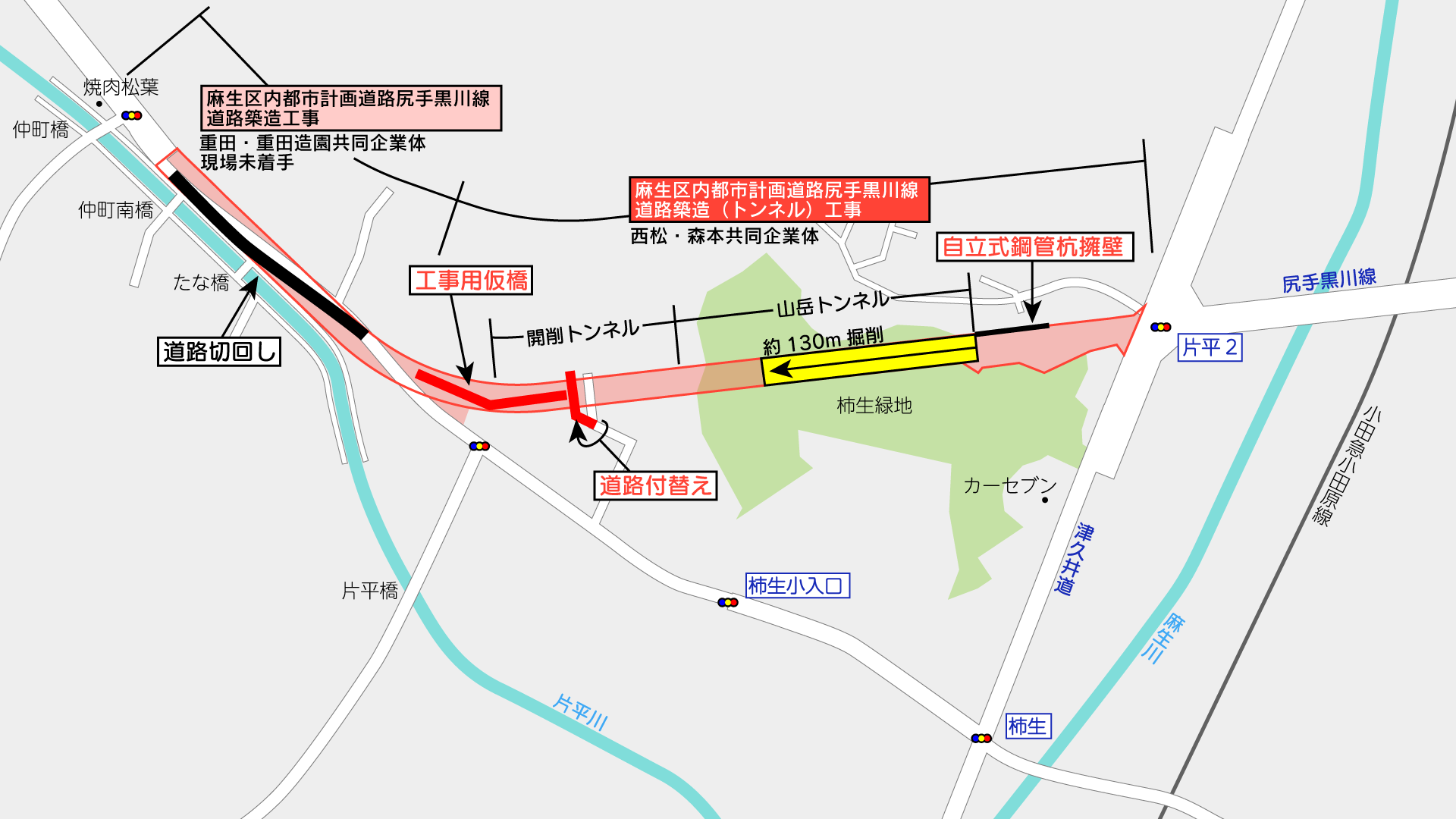 トンネル工事は、片平2丁目交差点と県道137号(上麻生連光寺)の間の区間で行われています。