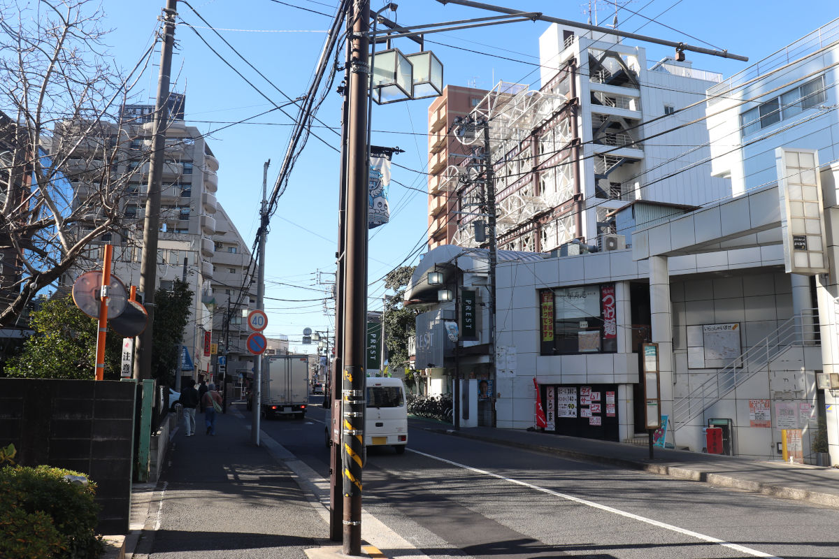 現況道路は幅員12m程度ですが、これが20mに広がる計画です。写真正面のビル付近は左側に一部拡幅する区間がありますが、JR南武線を越える付近まではおおむね右側(北側)に拡幅する計画です。