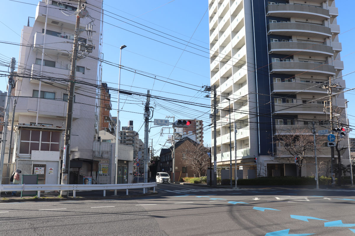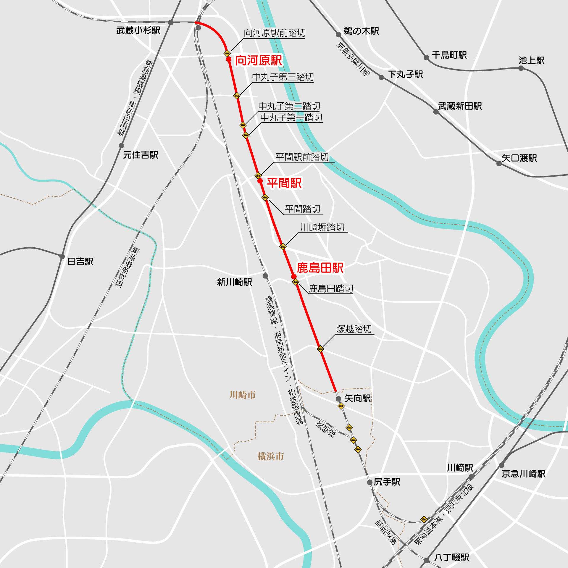 JR南武線の平間駅北側のところでJR南武線と交差します。現在は平間駅前踏切で平面交差となっています。