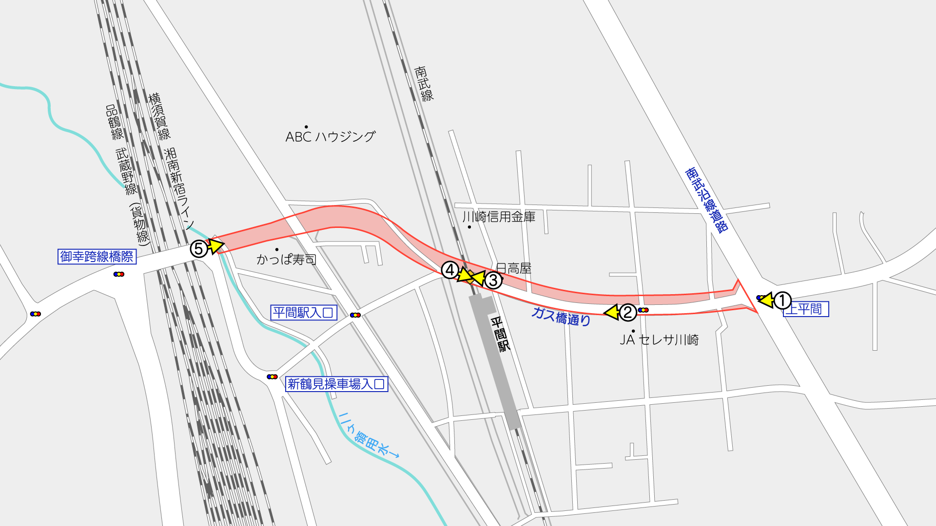 JR南武線交差部から西側は、現道から外れ、やや北向きに進路を変えながら、横須賀線などを越える御幸跨線橋方面にショートカットする計画です。