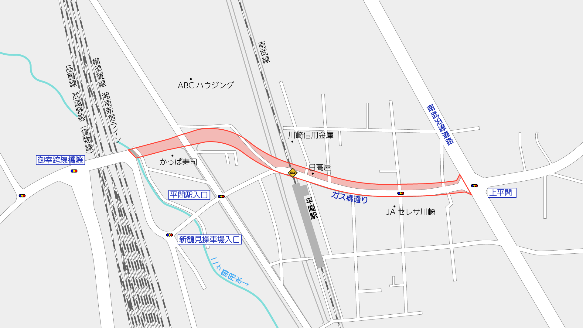 2025年1月に事業認可され、JR南武線連続立体交差事業(矢向駅~武蔵小杉駅間)に合わせて整備が進められる予定の都市計画道路です。平間駅前の区間のガス橋通りを拡幅・バイパス化するものです。
