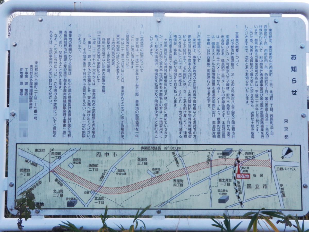 ここから先は法解釈の話にもなると思うので、誤ったことを書くとマズいので詳細は省きますが、都市計画法、土地収用法どちらにも周知や公告、掲示の方法について定めがあります。私が多く見てきた都市計画事業では、都市計画事業の認可があった時点で、その認可について・概要・用地取得について・売買の制限についてなどを示した看板(こんなの)を掲示し、土地収用法個別の看板を掲示しているところは見たことがありません。