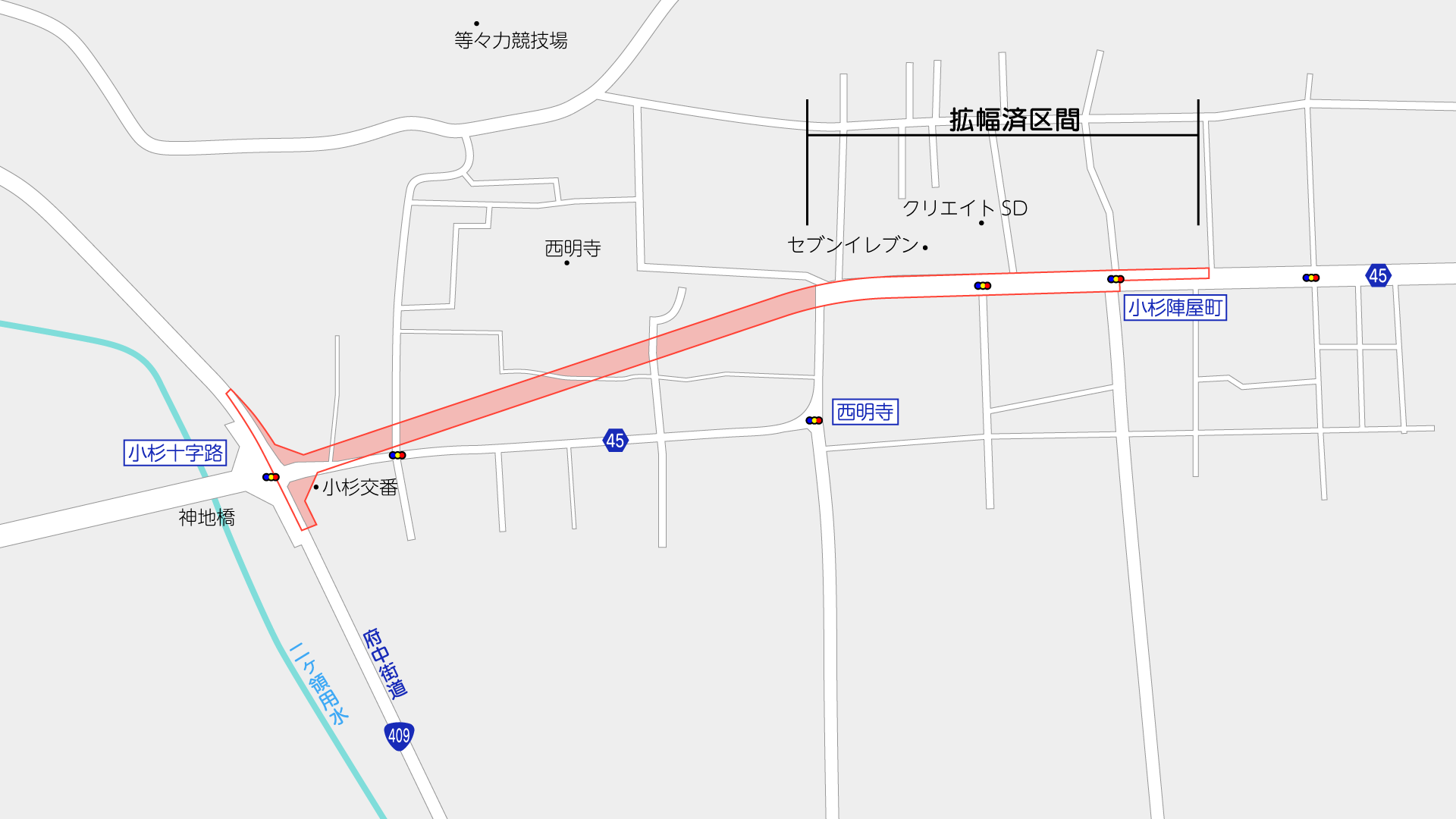 このうち、上記図で示した区間では、現道を拡幅及び道路を新設する事業が行われています。