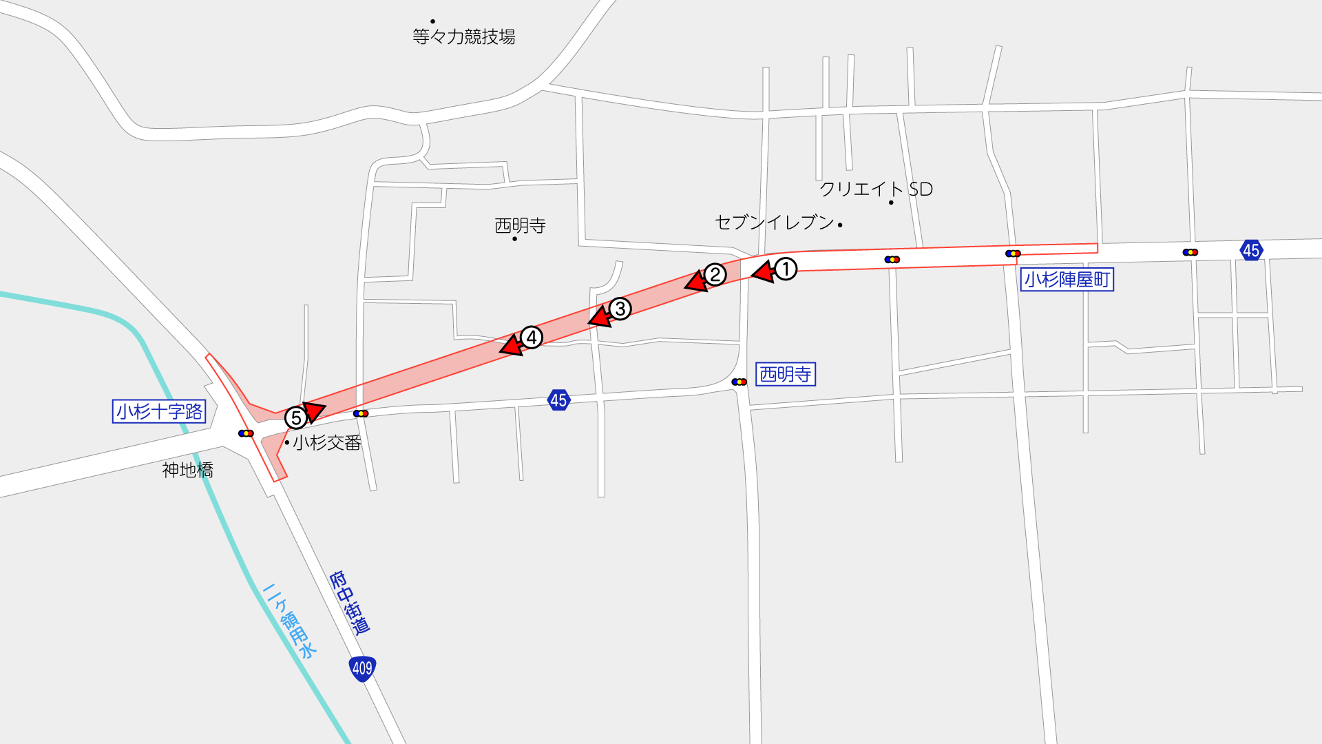中原街道が直角に折れる小杉御殿跡前が未整備区間の東端です。