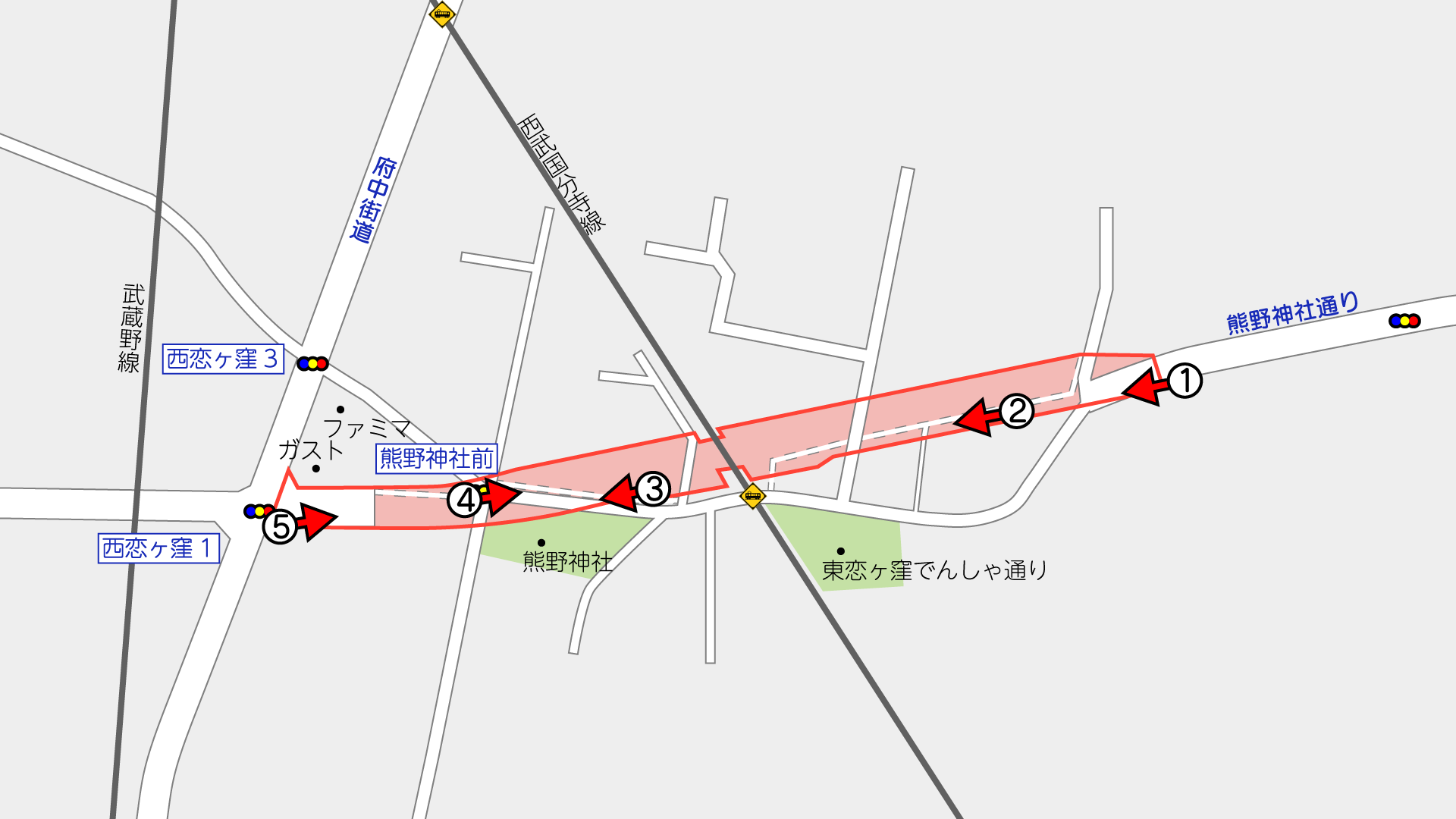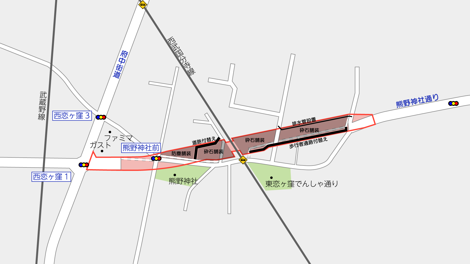 工事図面によると、この工事では、西武国分寺線東側で排水管の設置を行うほか、歩行者通路として暫定利用されている通路を付け替えるとともに、西武国分寺線西側で道路の付替えを行うもののようです。