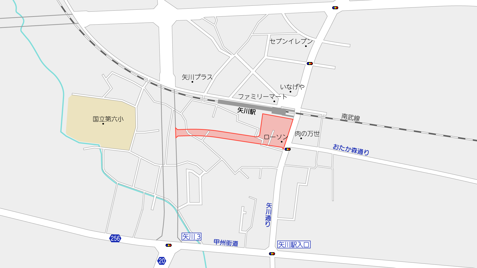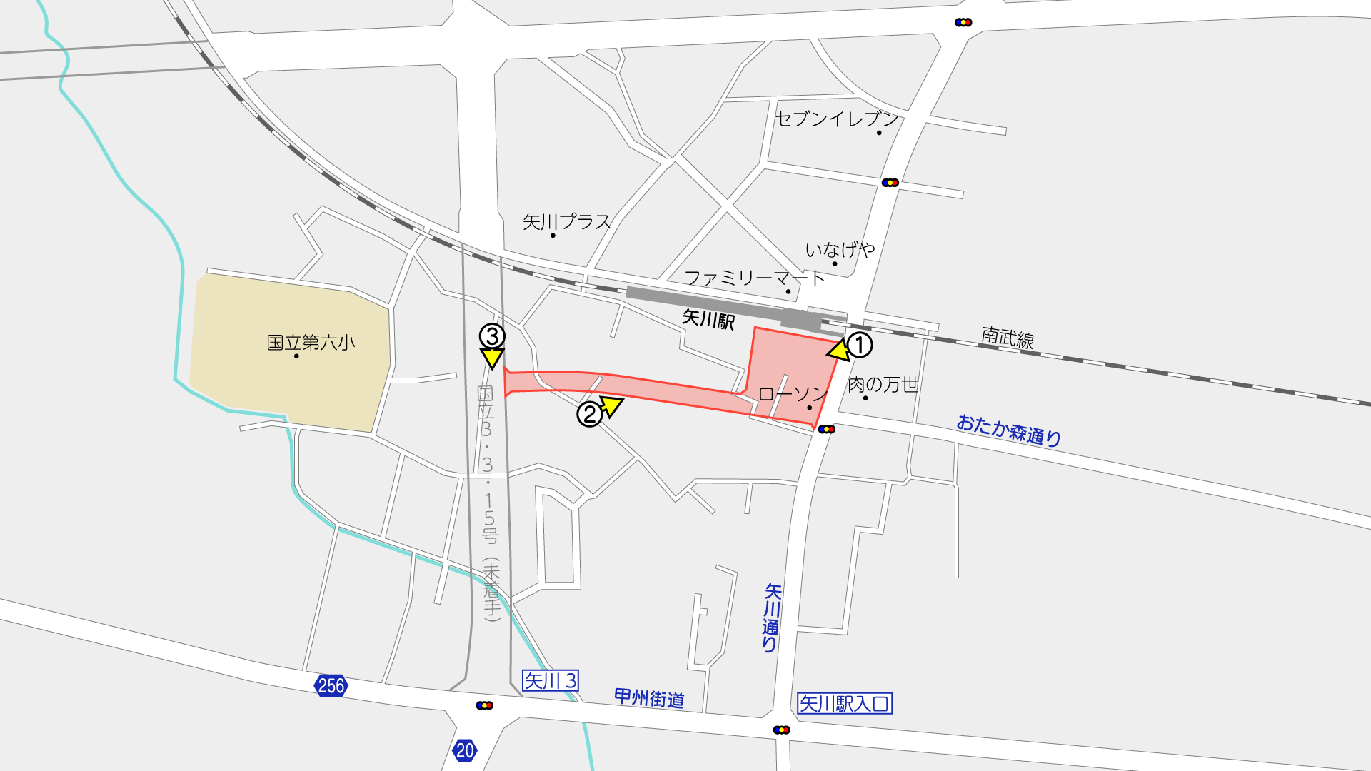 駅前広場が計画されているのは、JR南武線矢川駅の南側、矢川通りに面した区域です。広場の計画面積は約3,100㎡で、そこから西へ国立3・3・15号中新田立川線に向かって区画街路が計画される予定です。