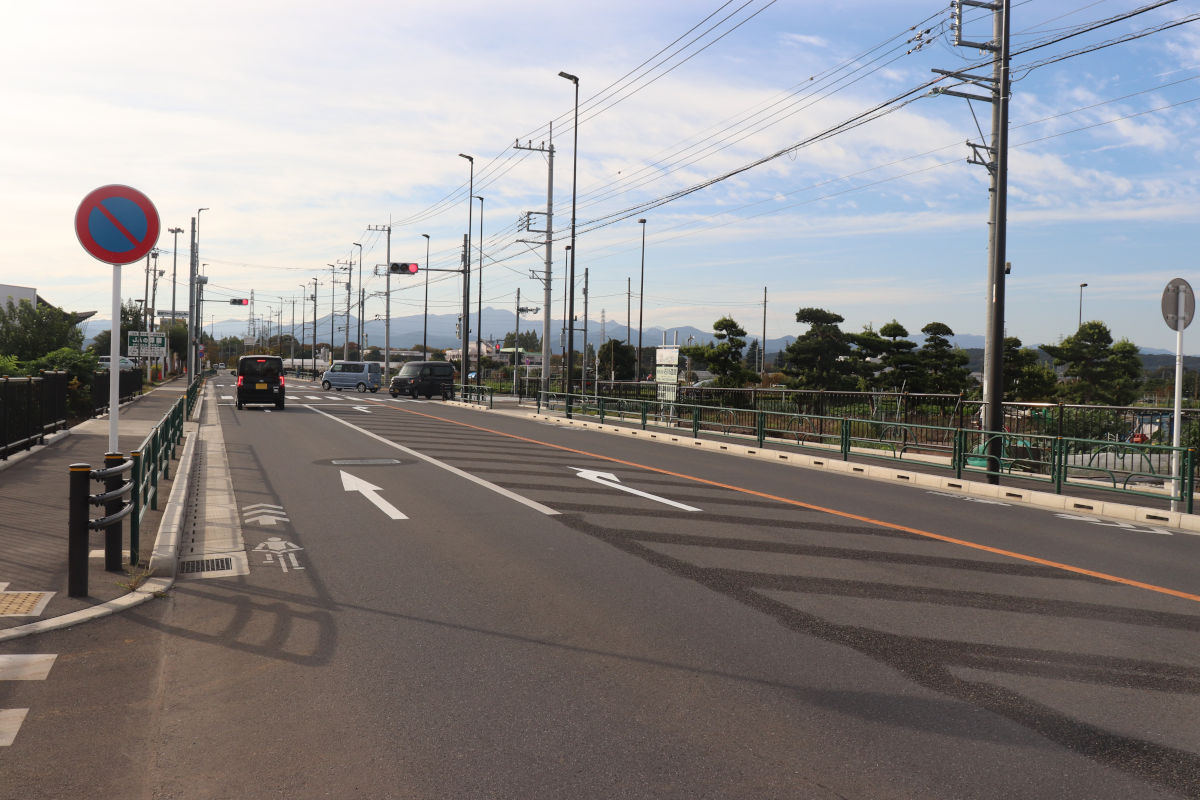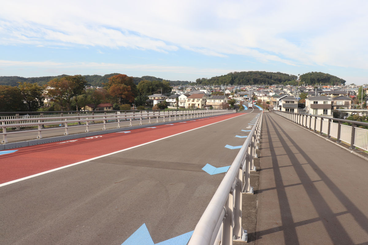 草花大橋は平井川などを跨ぎます。ほぼ直線の2車線で、北側に向かって下り勾配となっていて、下り坂側には赤色の薄層カラー舗装がされています。