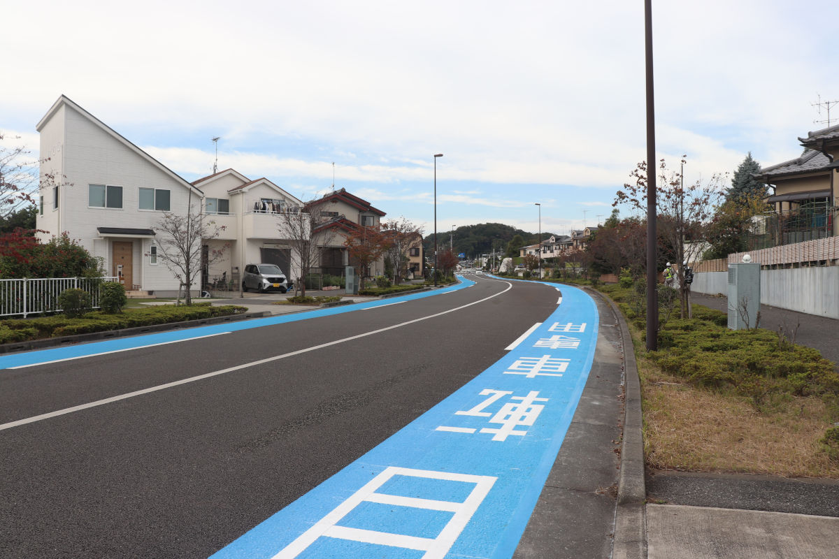 両側に自転車レーンが設置され、水色系の塗装がされています。