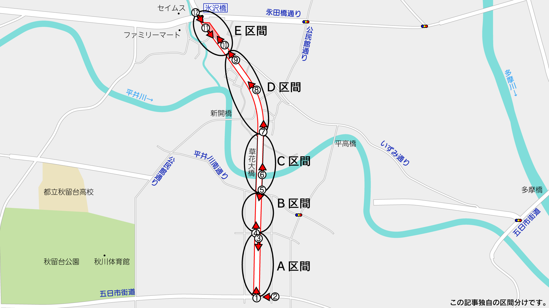 区間ごとに様子が異なるため、区間を分けて記載します。