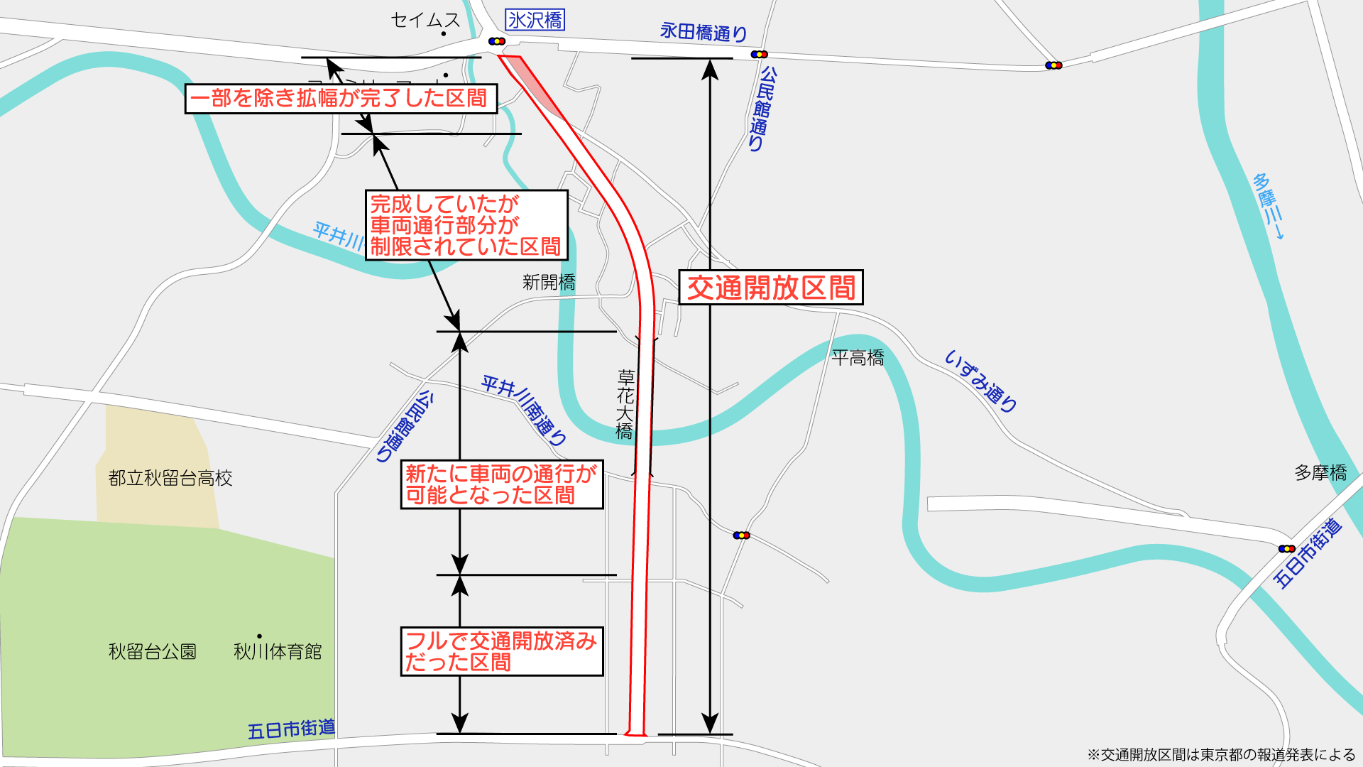 今回開通したのは、一般都道250号あきる野羽村線のうち、五日市街道7~永田橋通り165間の約1.2kmの区間です。(東京都の報道発表による)
