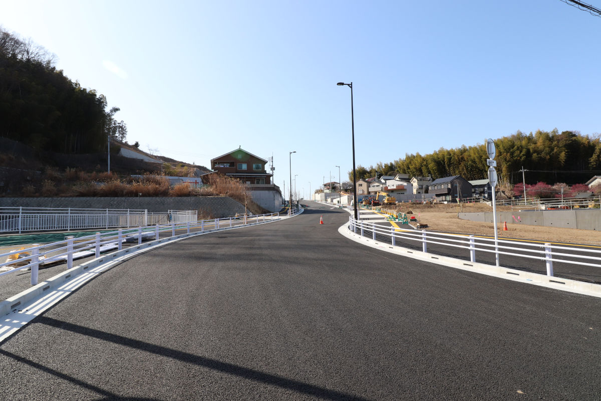この付近は、旧道路の線形に沿うような形で、蛇行した道路となっていますが、将来的には大きく外側に膨らんだカーブに線形改良する計画で、既に用地の確保は行われています。