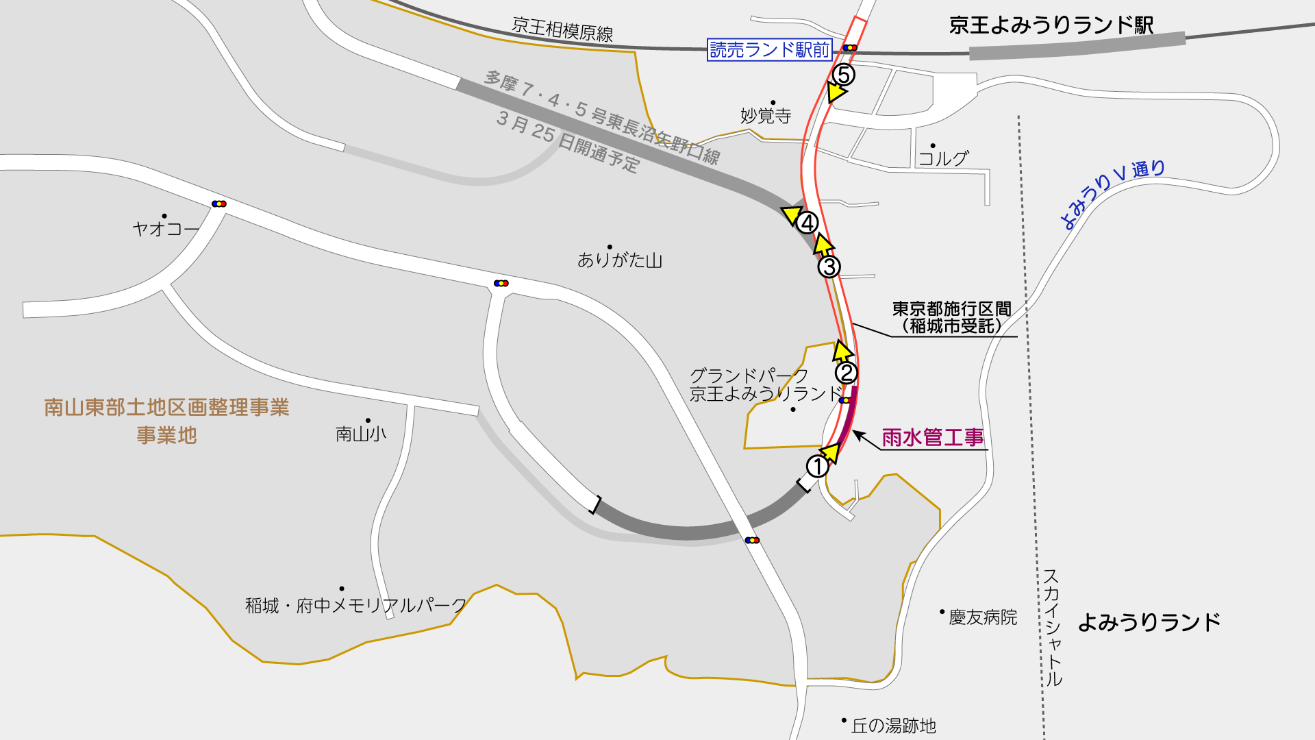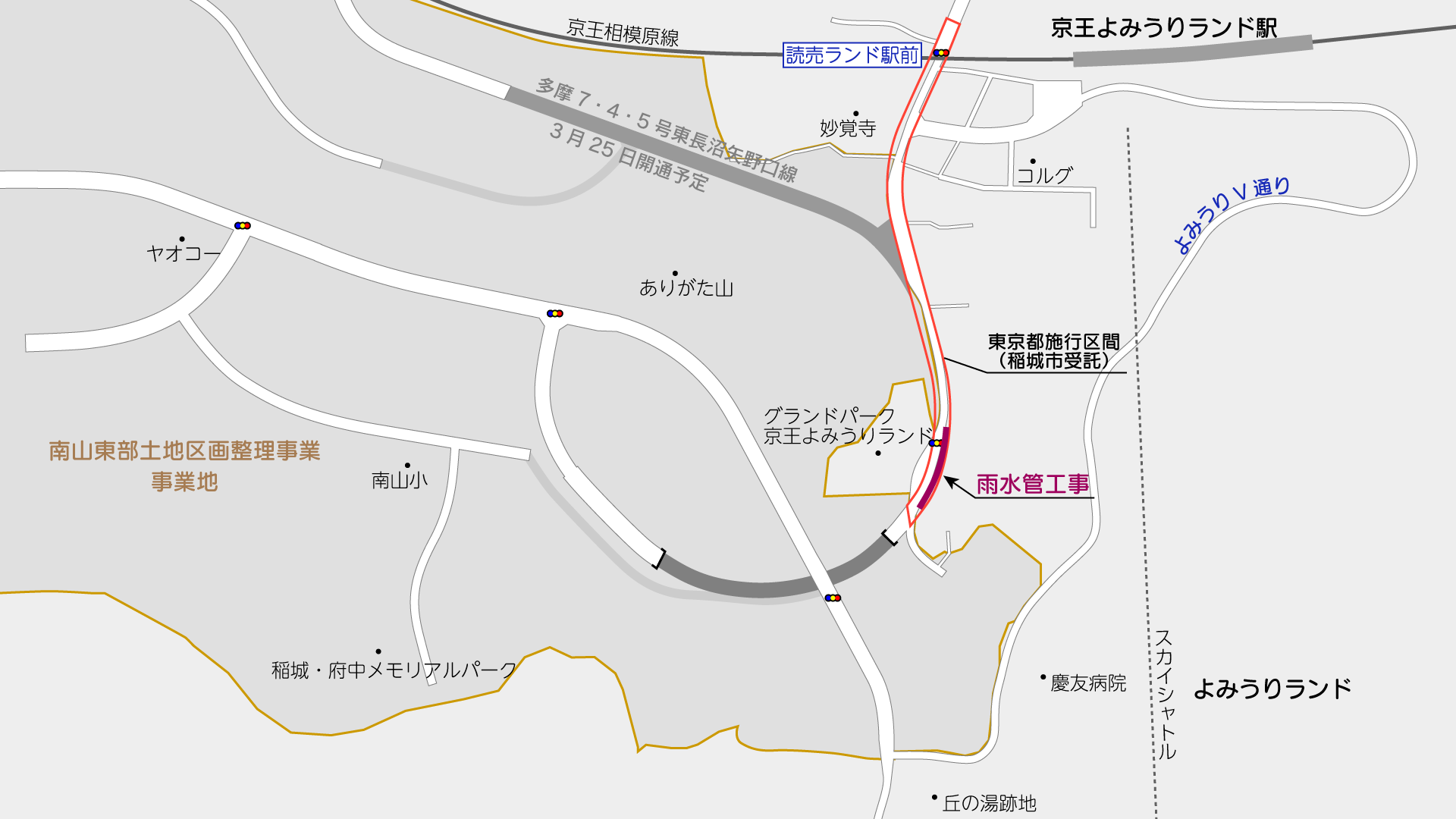 京王相模原線交点付近~「グランドパーク京王よみうりランド」付近までは東京都が、それ以南は南山東部土地区画整理組合が施行しています。
