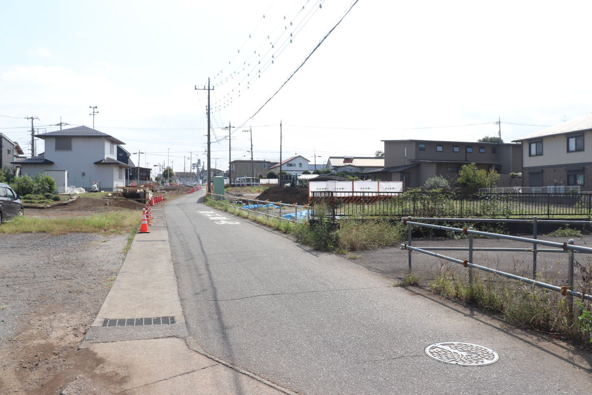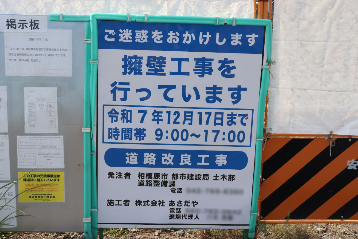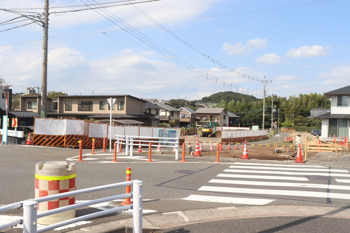 町田街道と交わる交差点南側50m先からが事業中です。ここから約50mは完成しています。