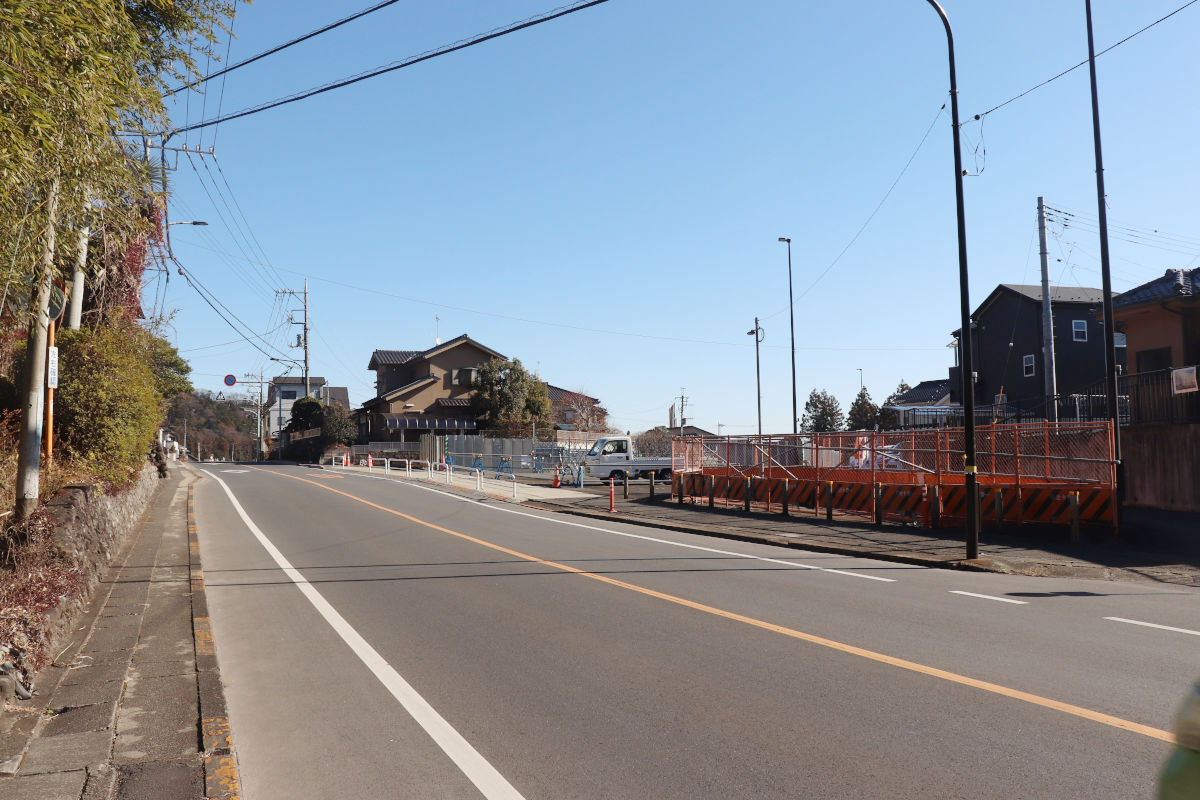 写真③付近までは縁石や道路照明などの整備がされていますが、車道部は仮囲いがされていて通り抜けることができません。