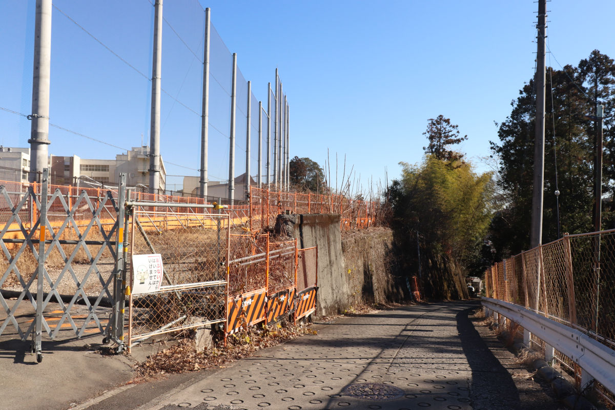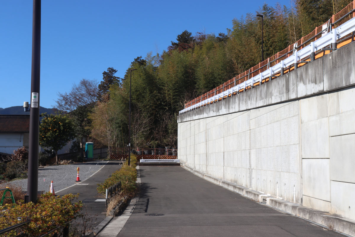 まだ斜面地の処理が終わっていない区間があることから、同様の鋼管杭擁壁等の工事は行われると見られます。