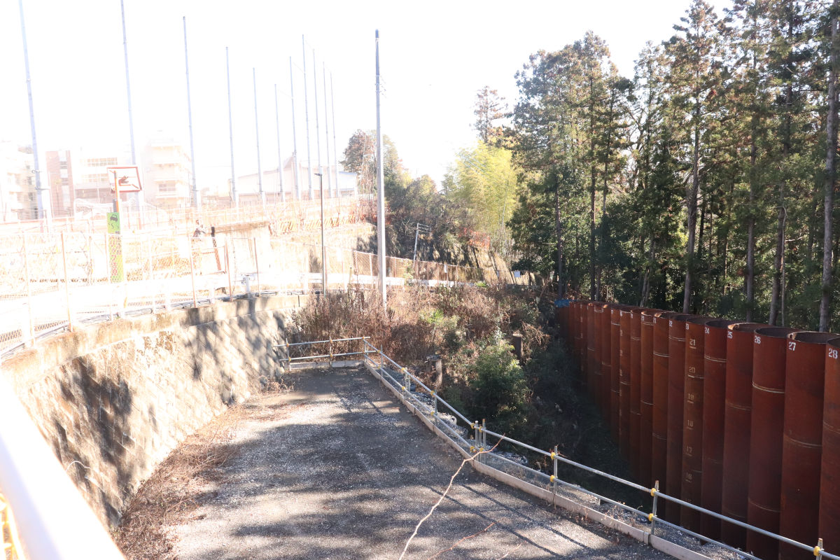 青梅第一中学校・都立多摩高校の南側は急峻な斜面地となっています。鋼管杭擁壁などにより土留めをして平らな土地を作る必要があり、順次工事が進められてきました。
