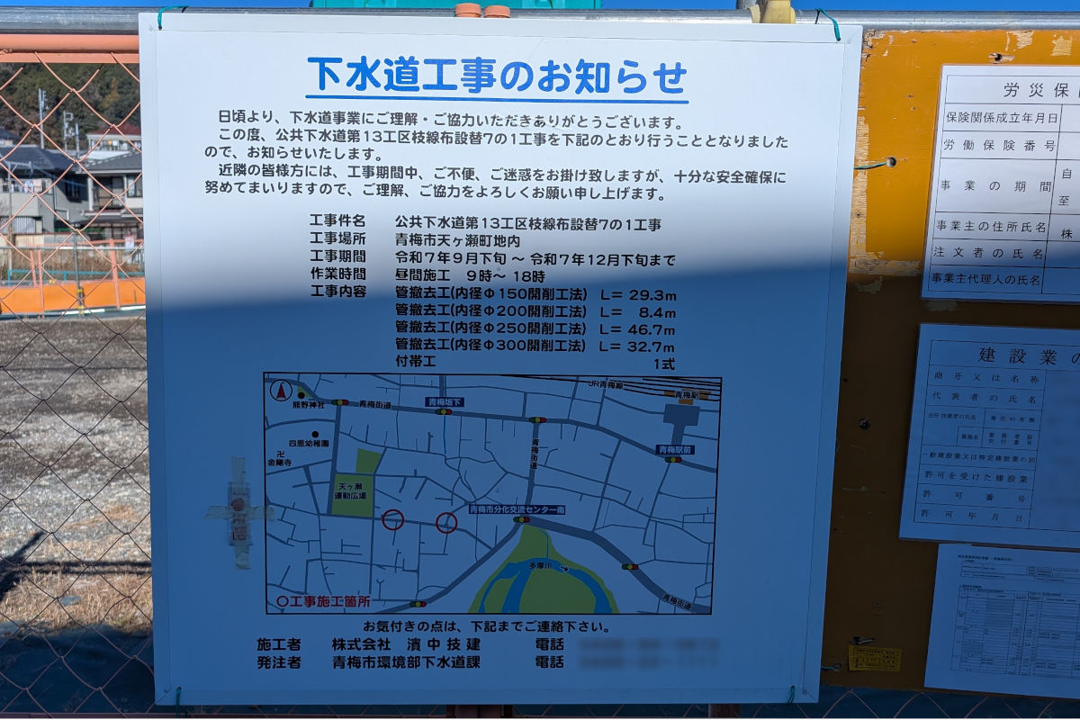 2025年度の年間発注予定(2025年12月1日公表)によると、「街路築造工事及び電線共同溝設置工事(青梅3・4・4天ヶ瀬)」が2026年2月上旬に公表予定とされています。