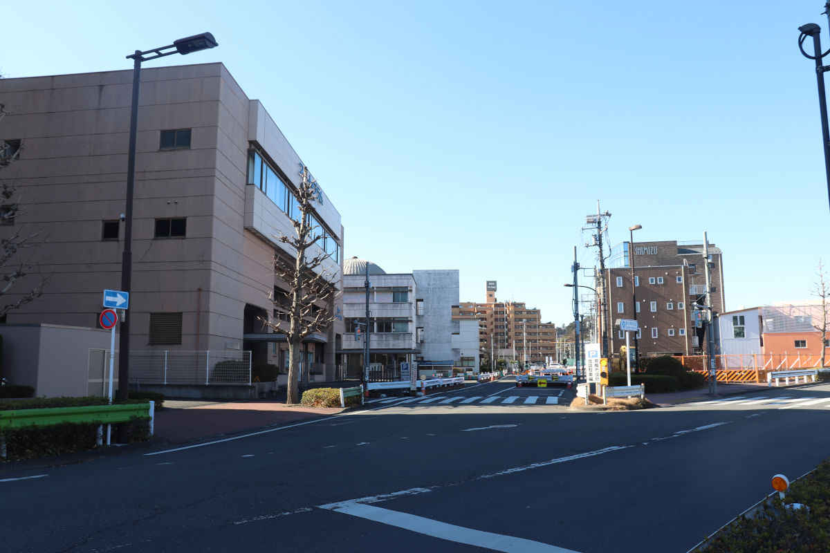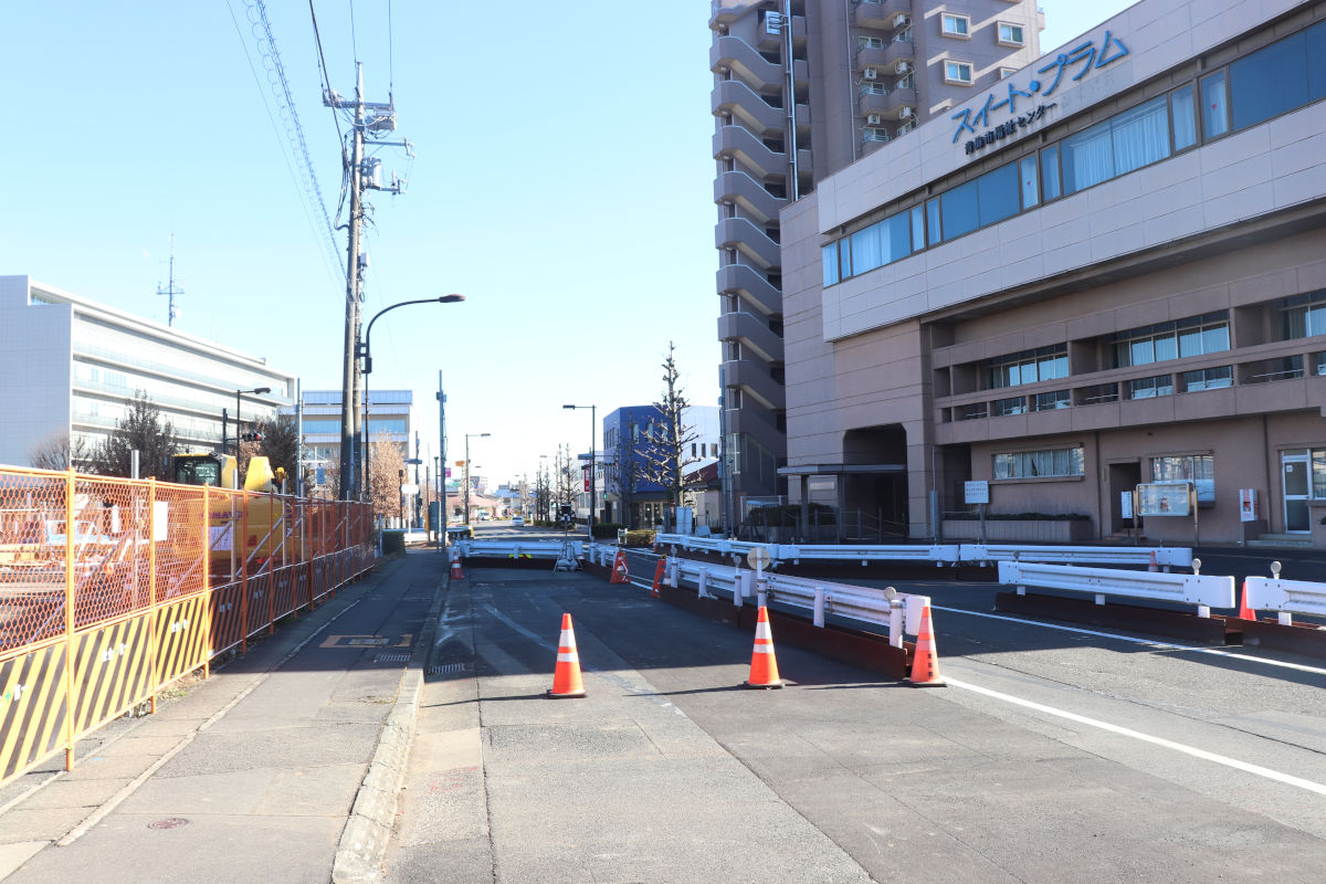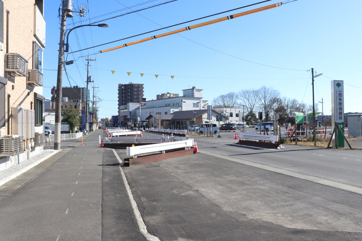 市議会答弁などによると、2024年度はこの交差点付近の南側で電線共同溝の整備と、車道を南側に移設する工事を行った模様です。