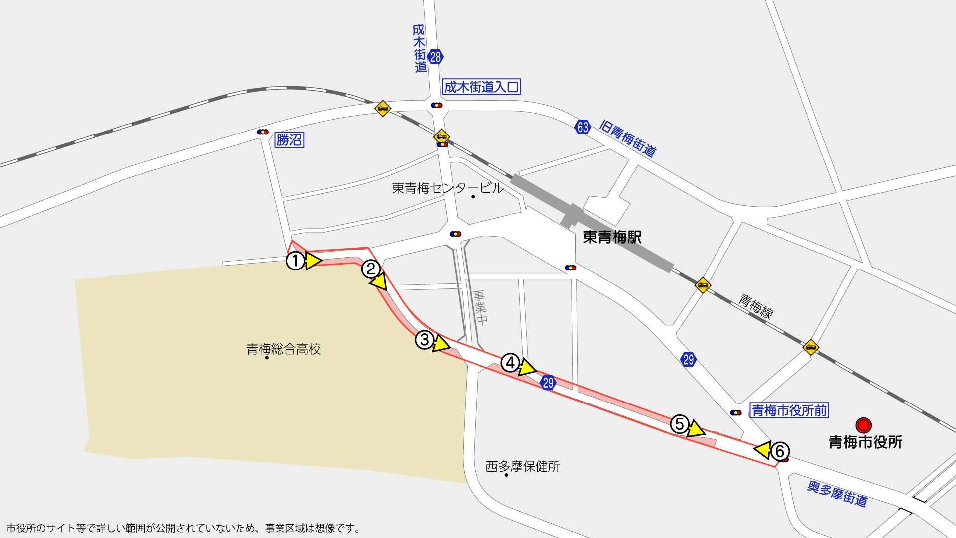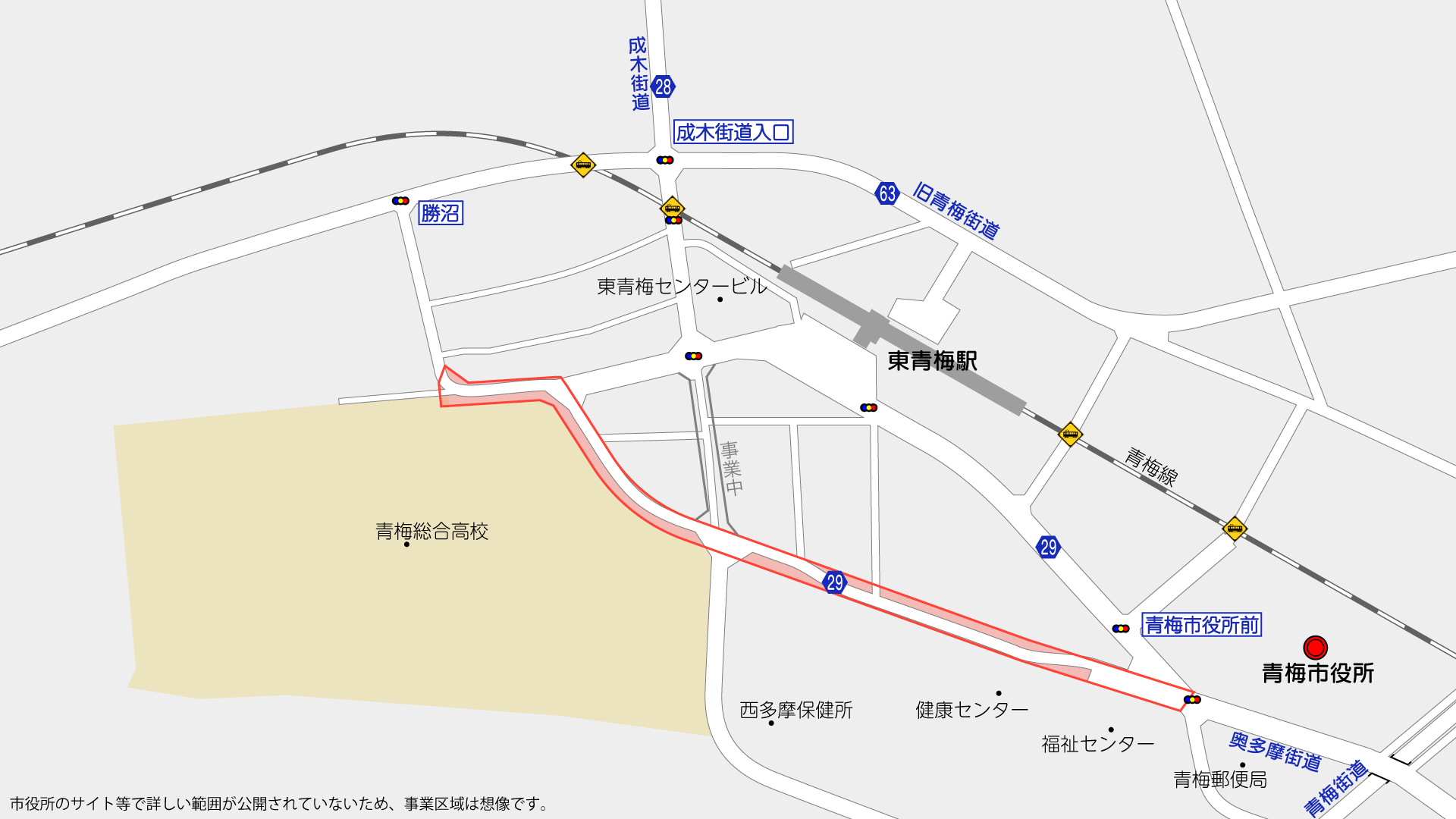 青梅市役所前~都立青梅総合高校前間で道路を拡幅するもので、東青梅駅前の奥多摩街道をバイパスしうる道路です。