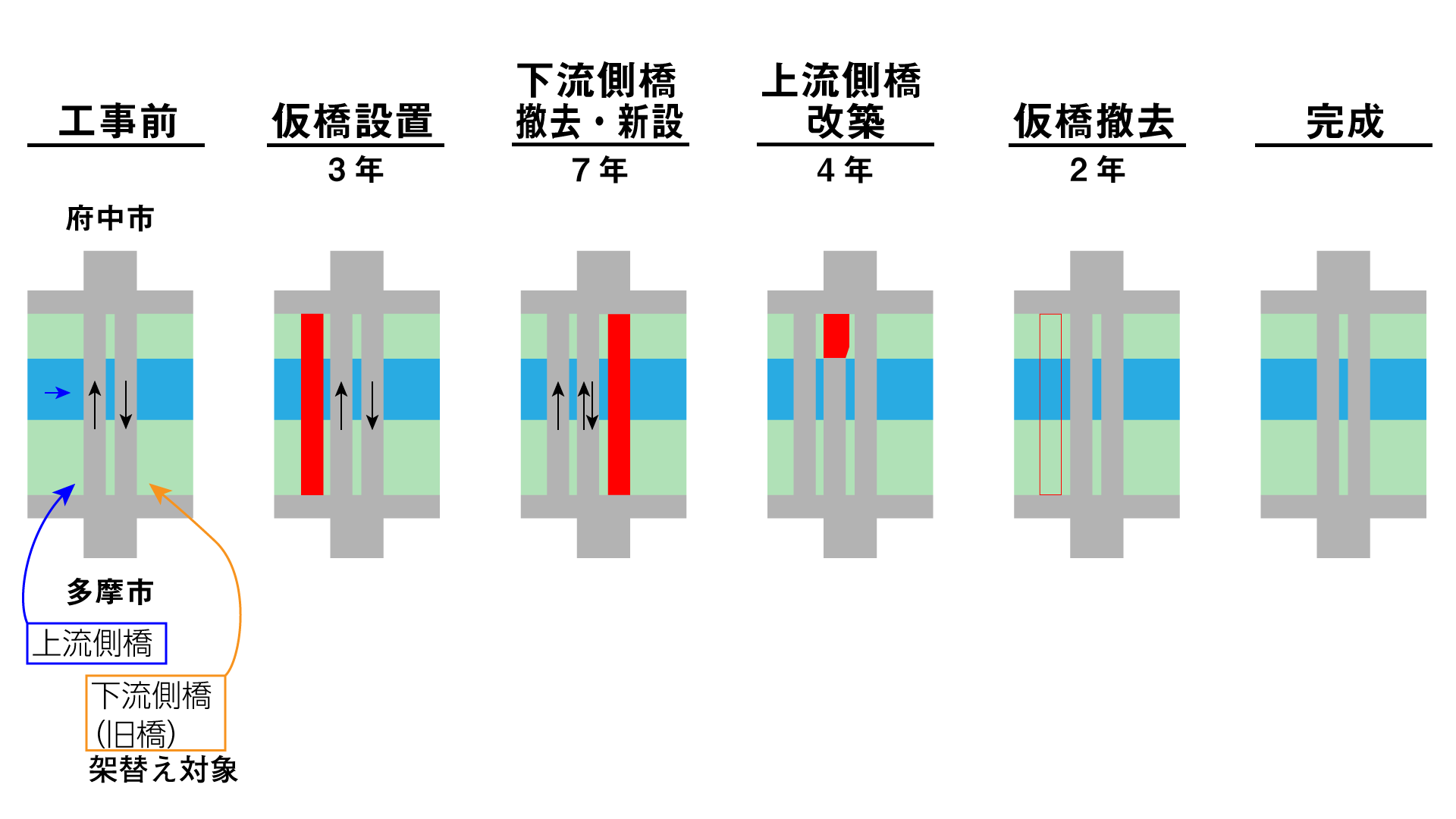工事では上流側橋の上流側に仮橋を設置し、交通を切り替えながら架け替えます。仮橋を用いた架け替えは多摩川中流部では初めてとなります。また、併せて上流側橋の改築を行います。