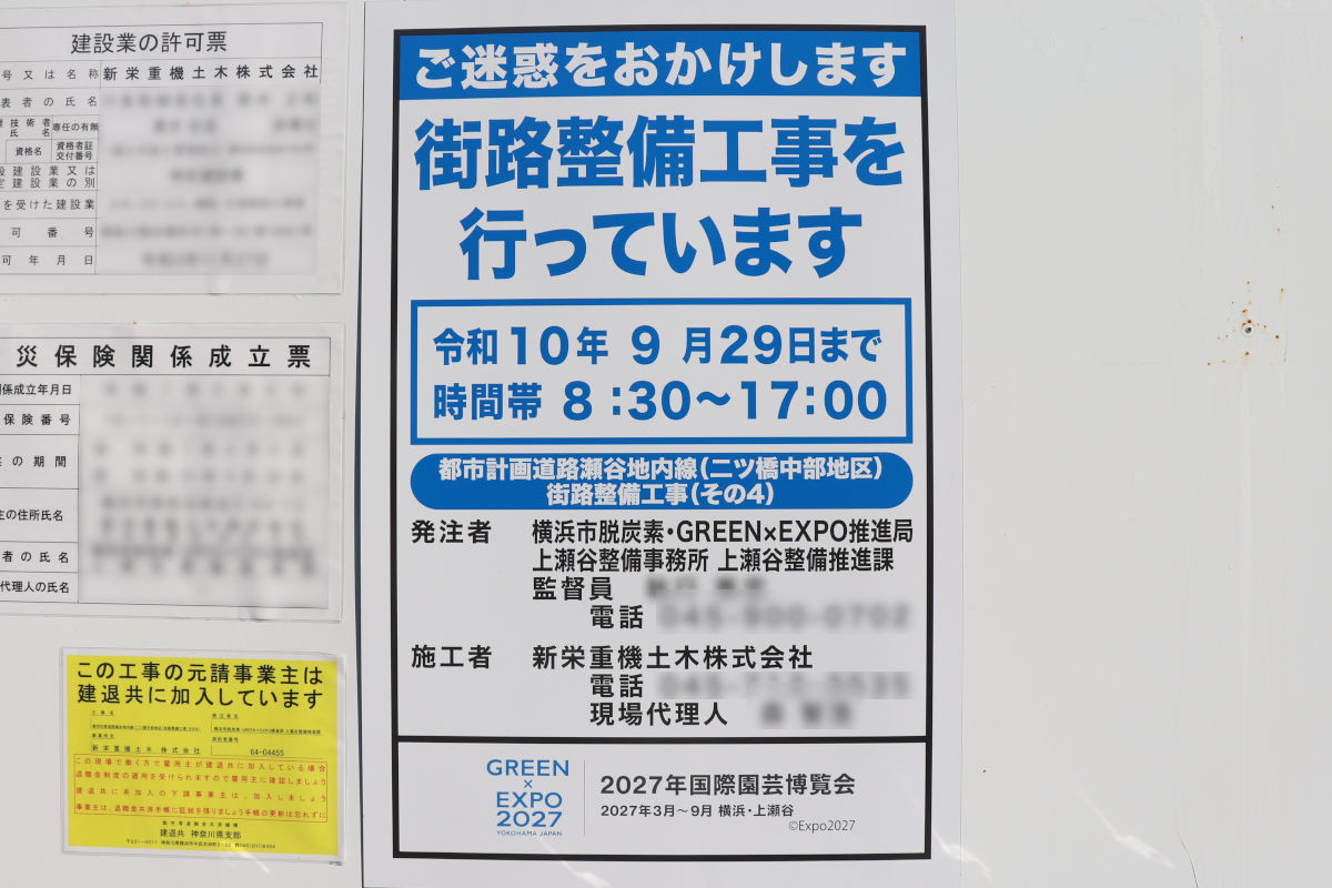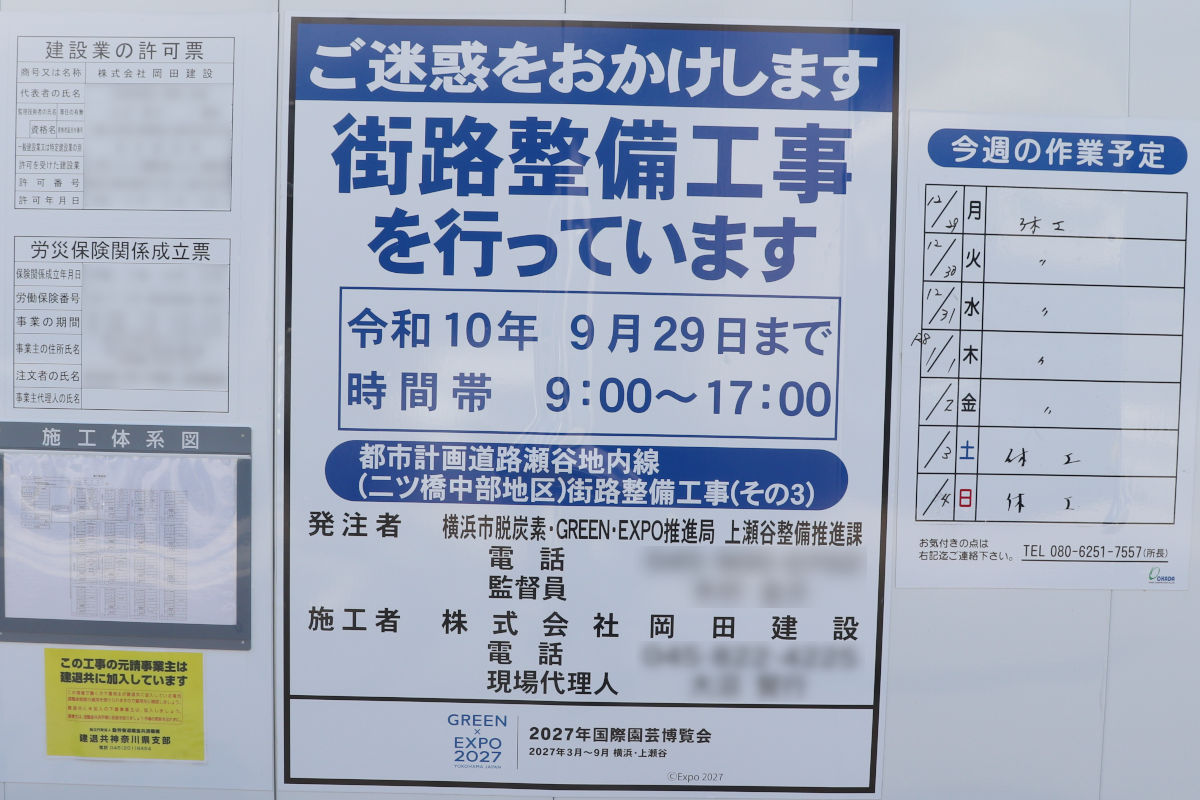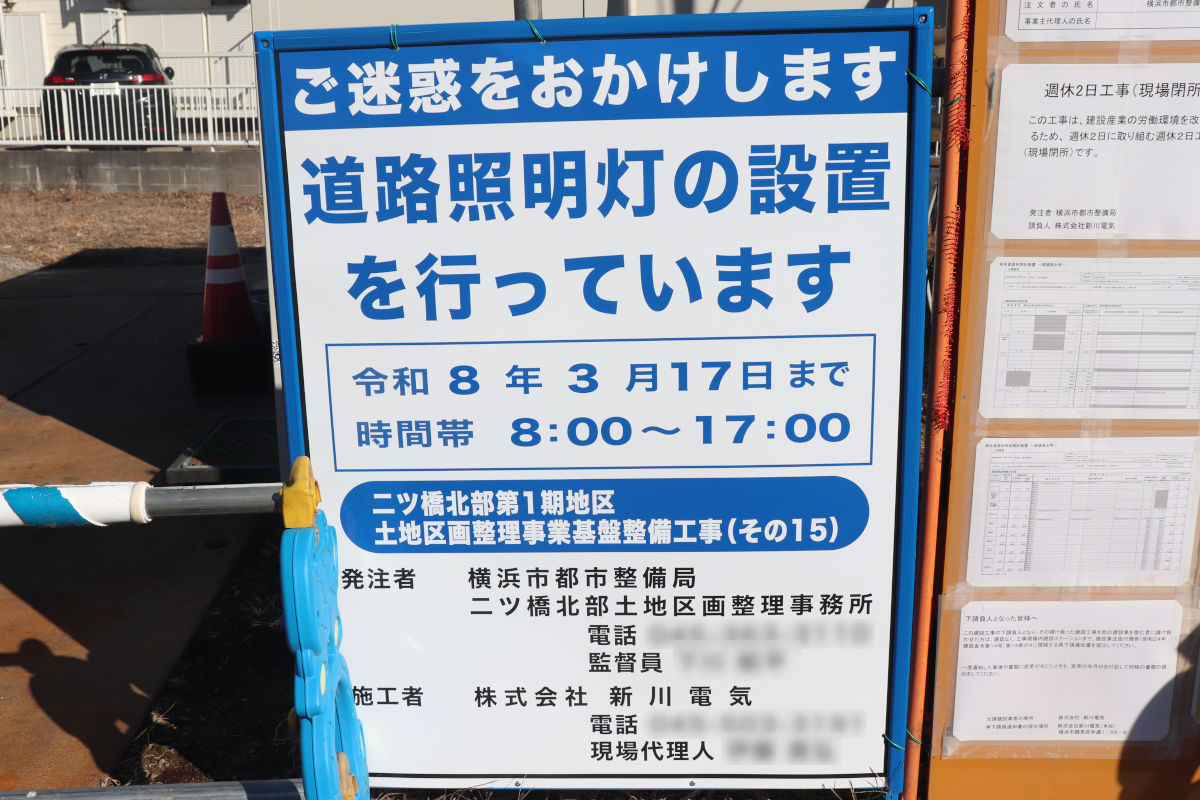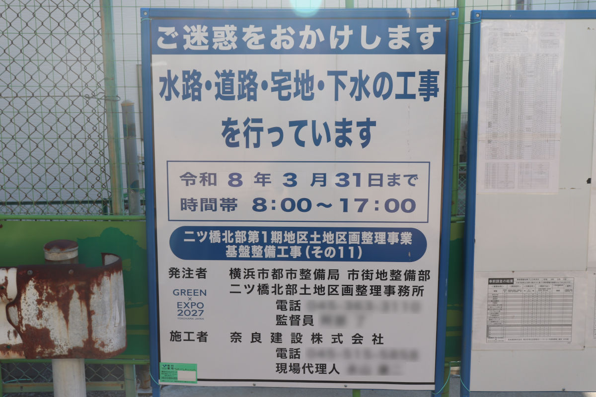 現地の状況と、横浜市のウェブサイトの状況から、現地の工事状況はこの通りです。看板が掲出されていたもののみです。