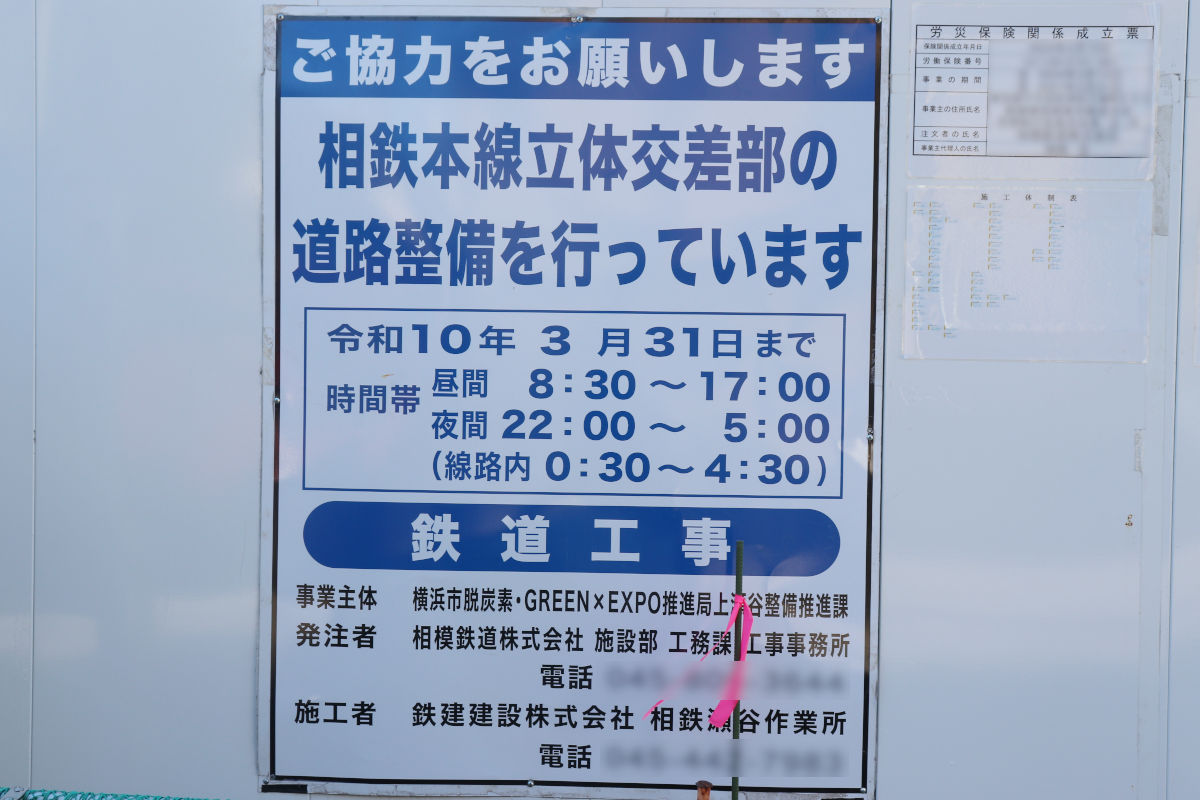相鉄線とはアンダーパスで立体交差する予定で、相鉄線直下の部分は相鉄に工事を委託して、アンダーパス構築工事が進められています。工事は相鉄から鉄建建設に発注されています。