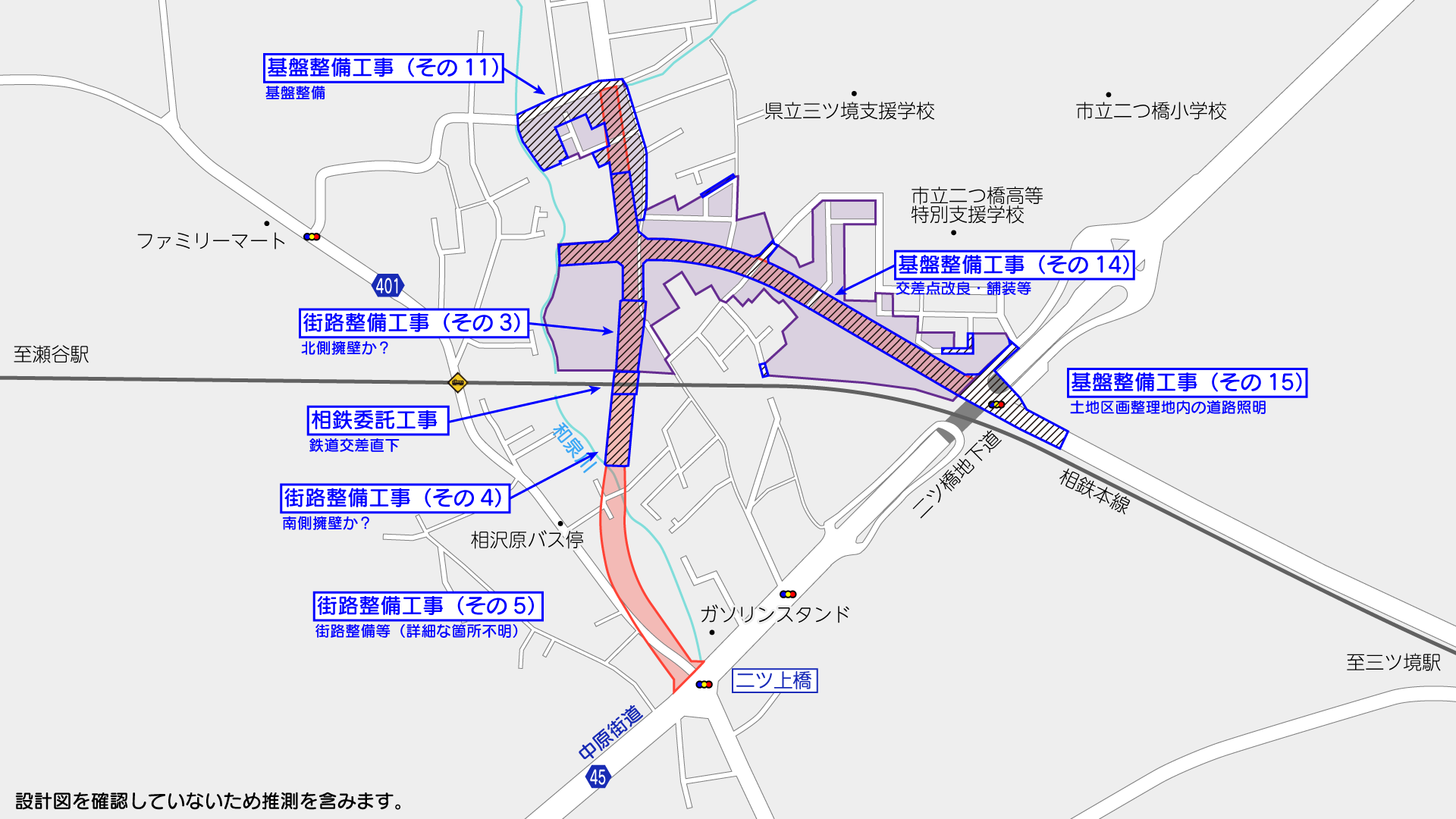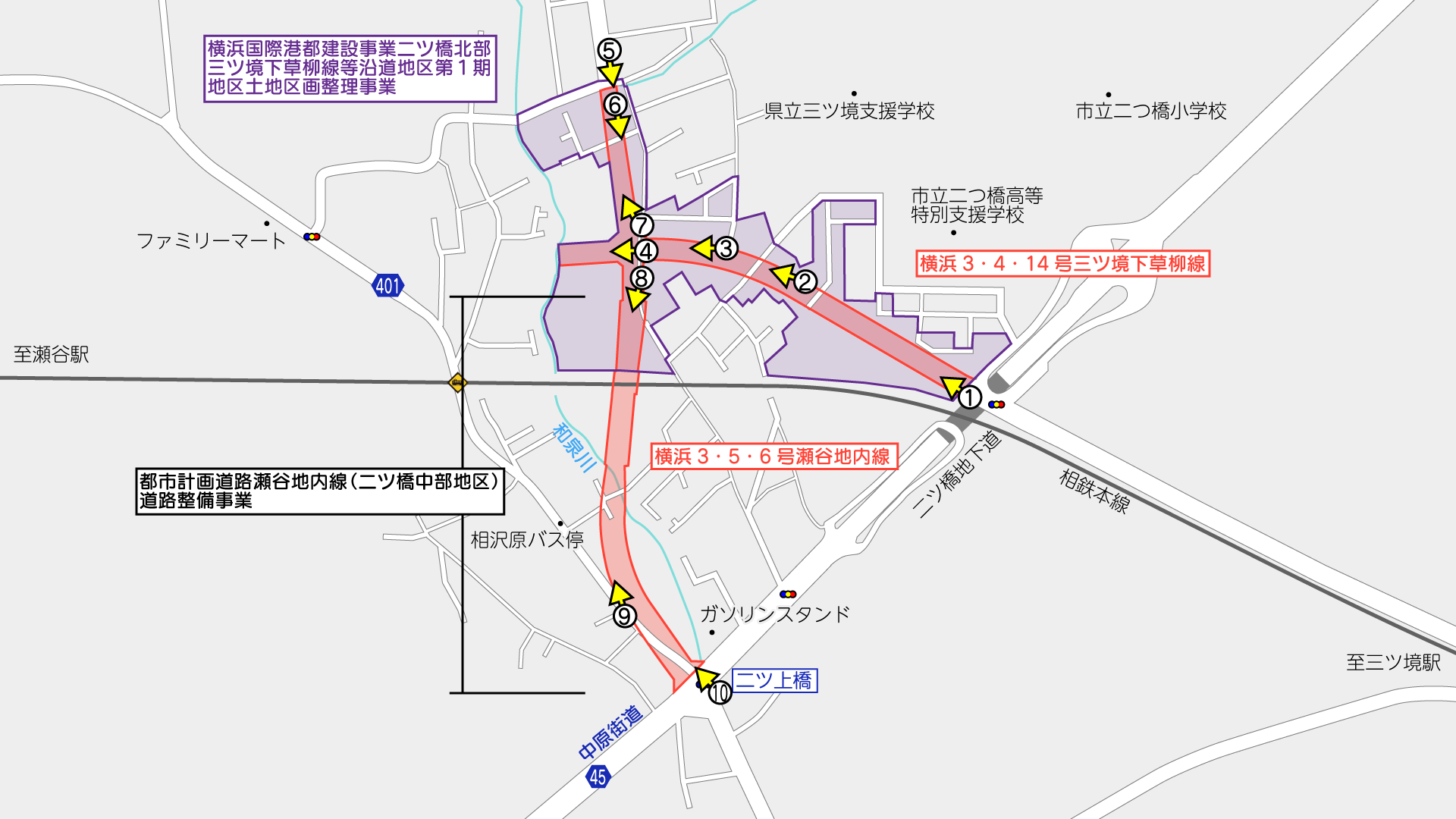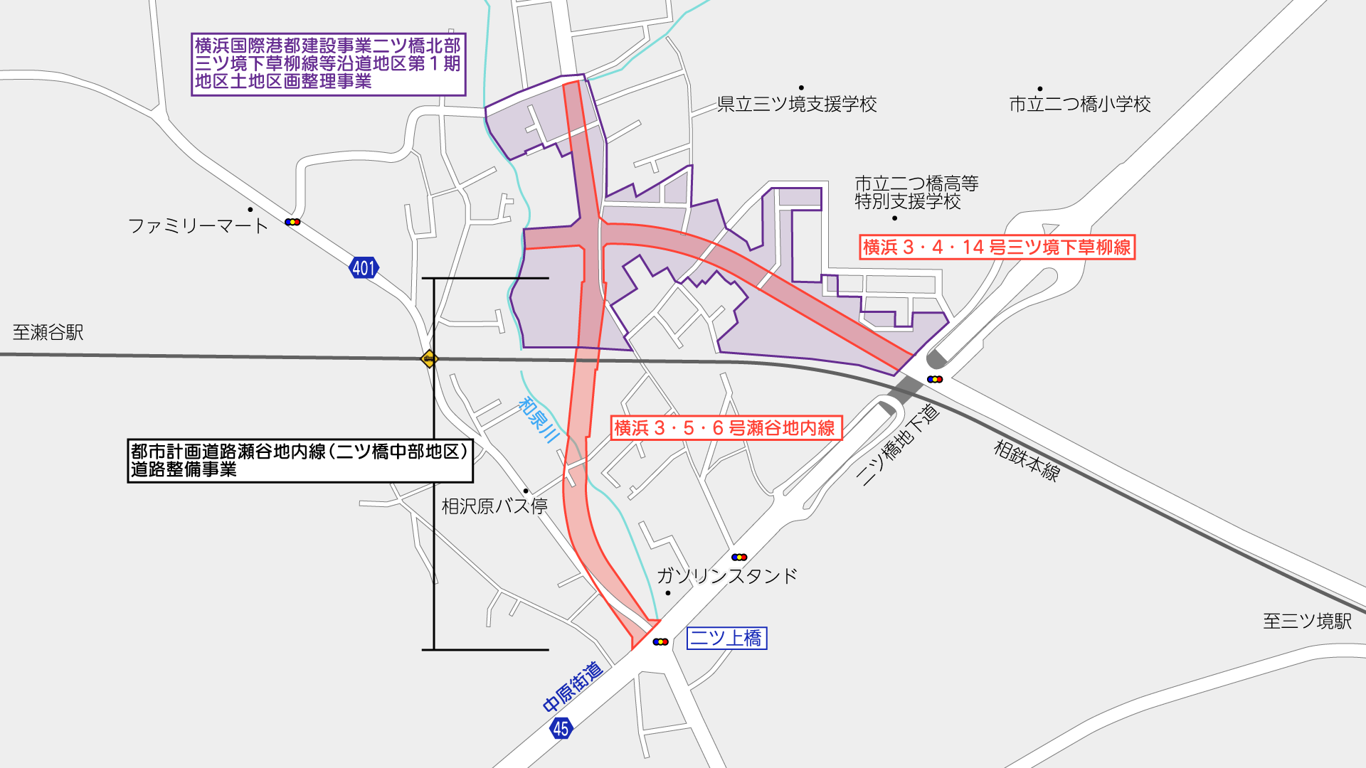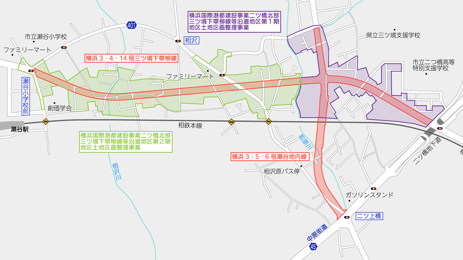 土地区画整理事業地内の「三ツ境下草柳線」と「瀬谷地内線」は2026年度の開通を、相鉄をくぐる「瀬谷地内線(二ツ橋中部地区)」は2027年に開催される国際園芸博覧会時に暫定通行が可能な状態とするよう、工事が進められています。