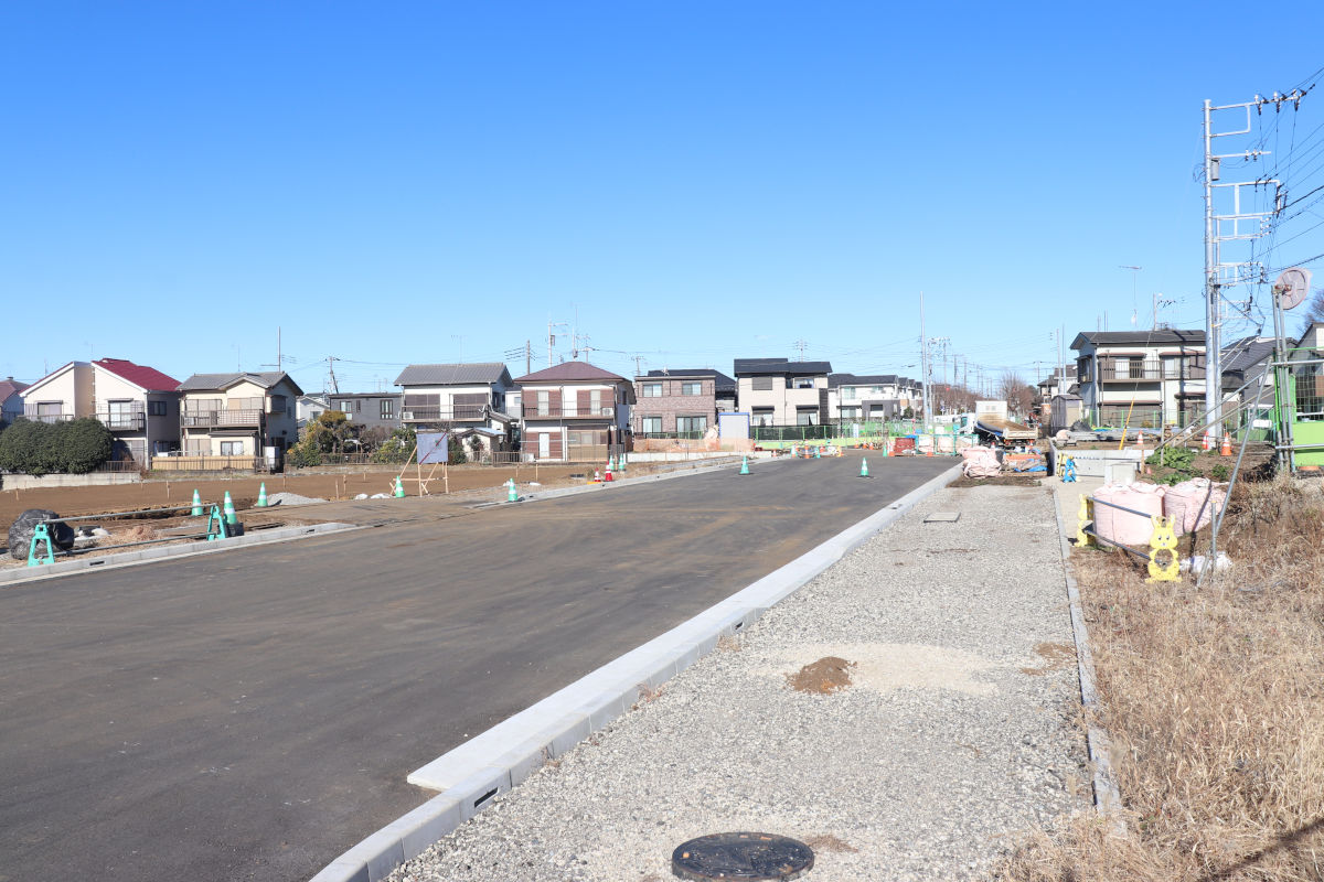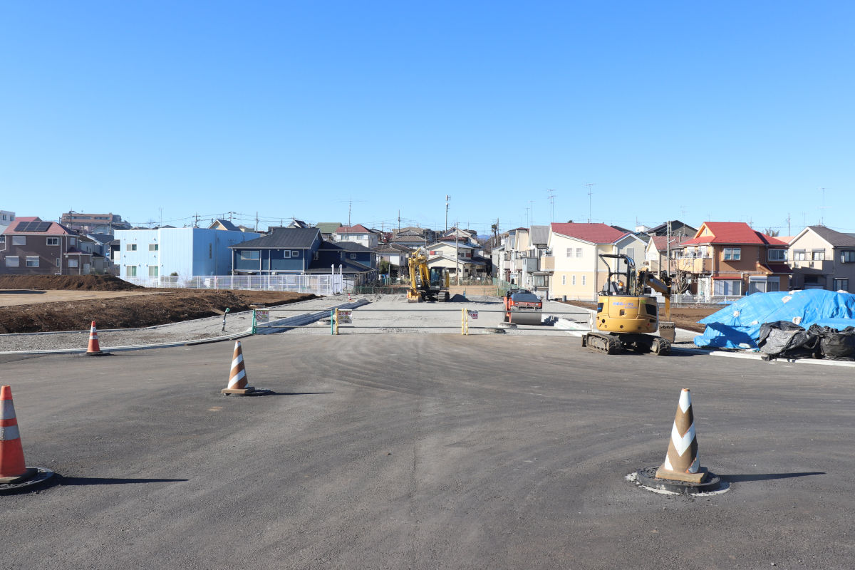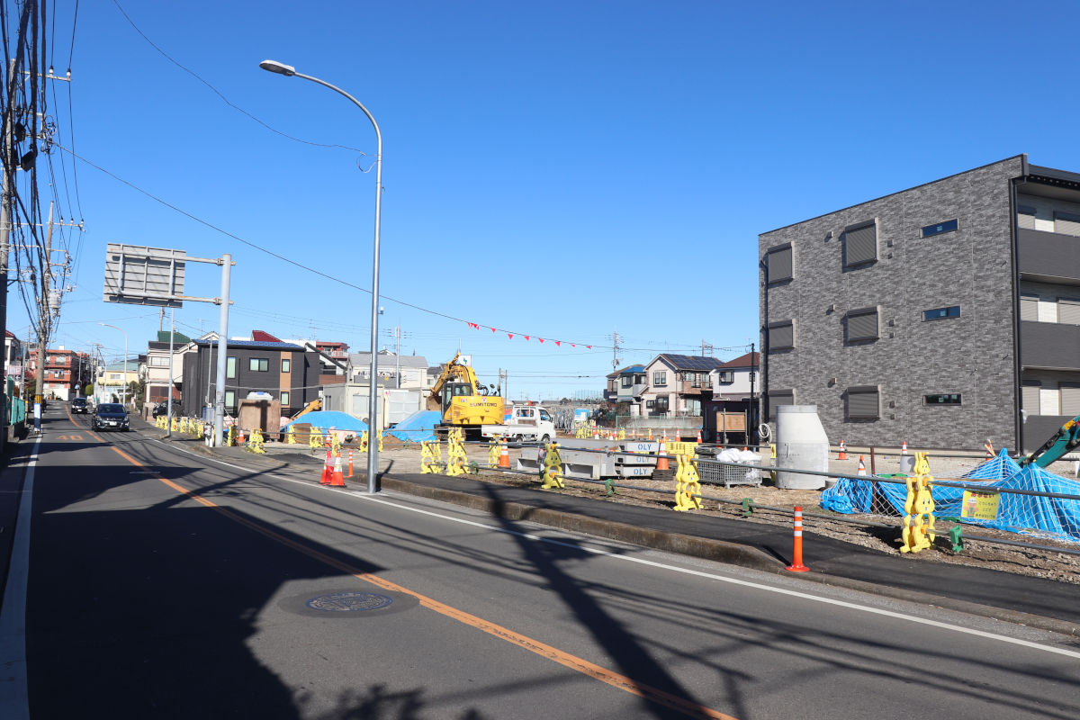 正面は三ツ境下草柳線で、この土地区画整理事業で整備されるのは、バックホウが置いてある場所までで、その先は未整備です。その先の区間については、土地区画整理事業を新たに事業化する方針で、既に説明会が開催されています。