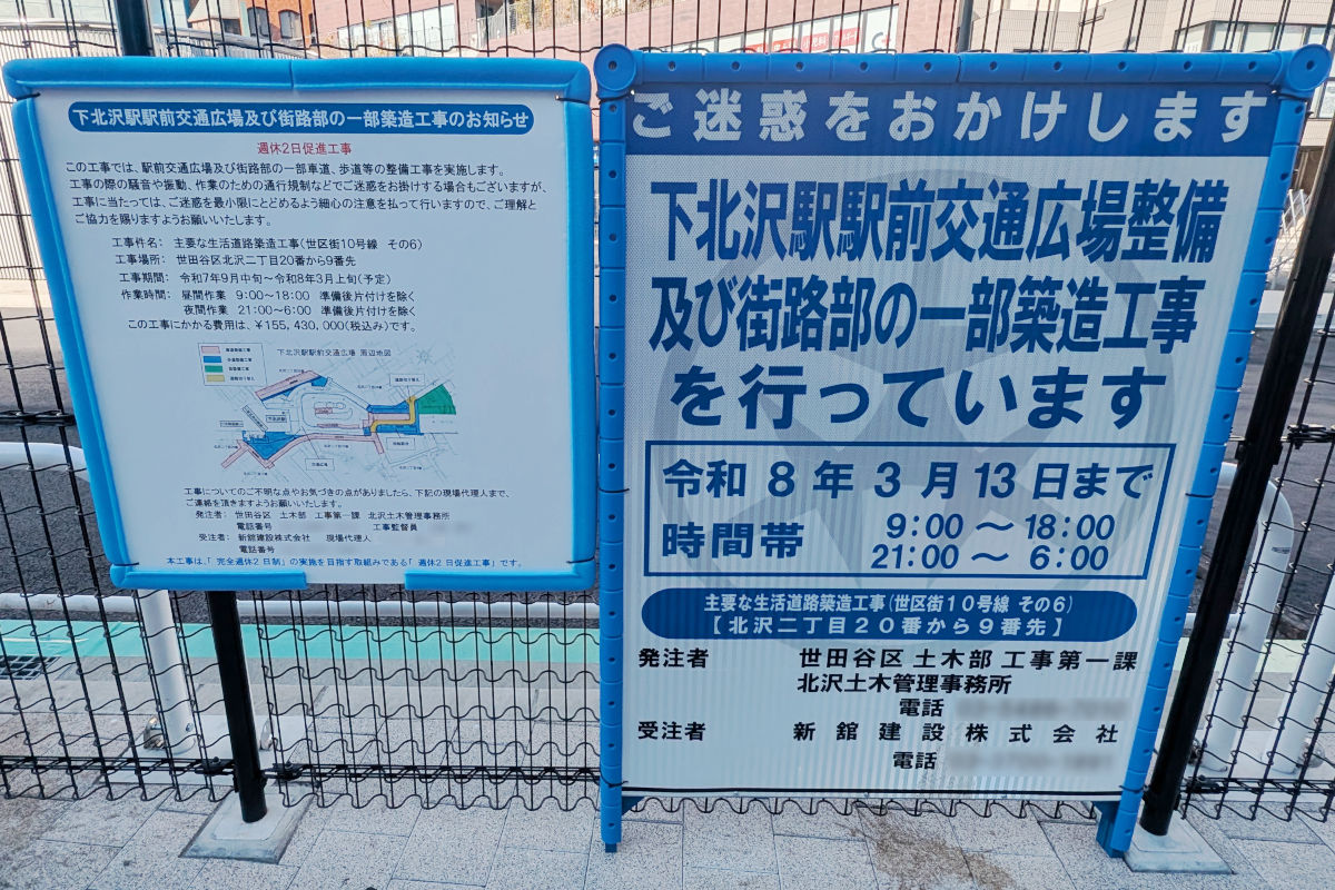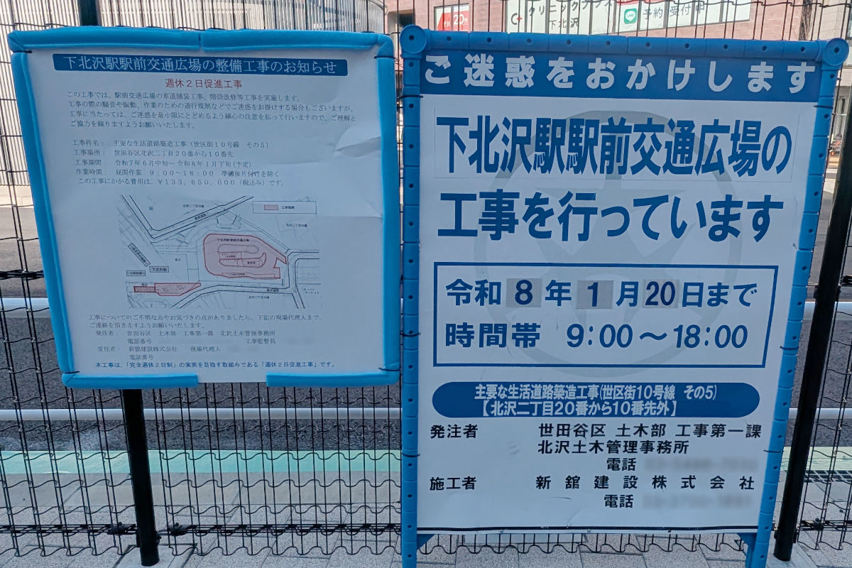 2025年12月30日時点で、下北沢駅前広場では下記の工事が行われていました。(年末年始休工中)