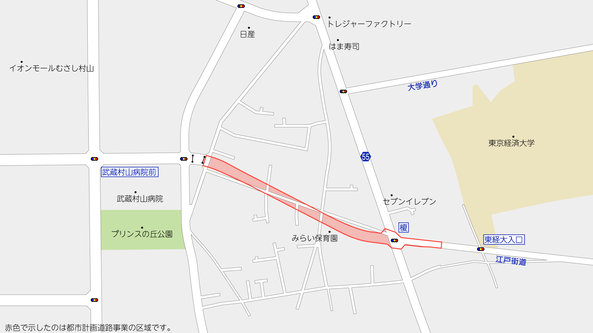 榎交差点から先は、武蔵村山病院北東角の交差点に向かって道路が整備される計画です。都市計画道路としては2021年11月30日に都市計画変更で区域決定が行われており、比較的新しい計画です。