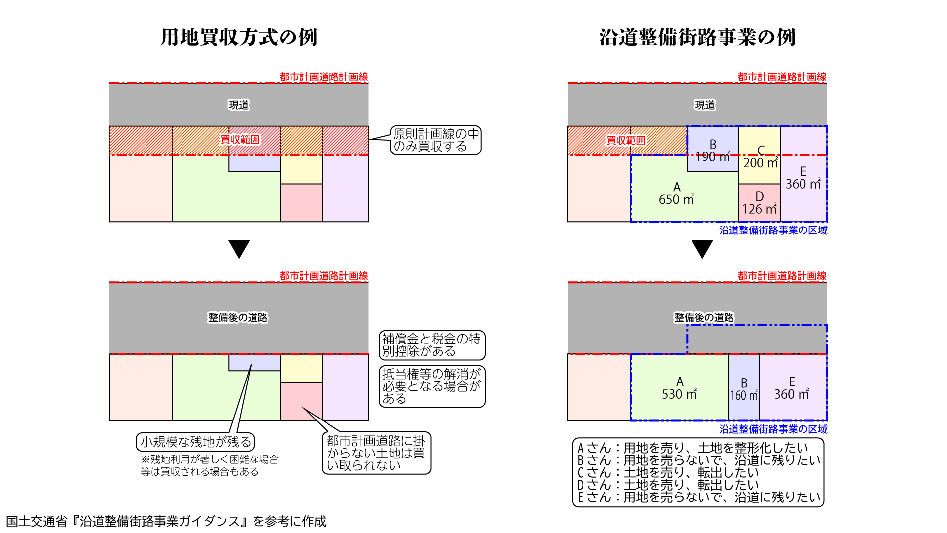 沿道整備街路事業は、用地買収方式の長所と土地区画整理方式の長所を組み合わせることで、土地を入れ替えたり、赤道などの法定外公共物を活用したり、転出希望者の要望に応えたりすることができます。