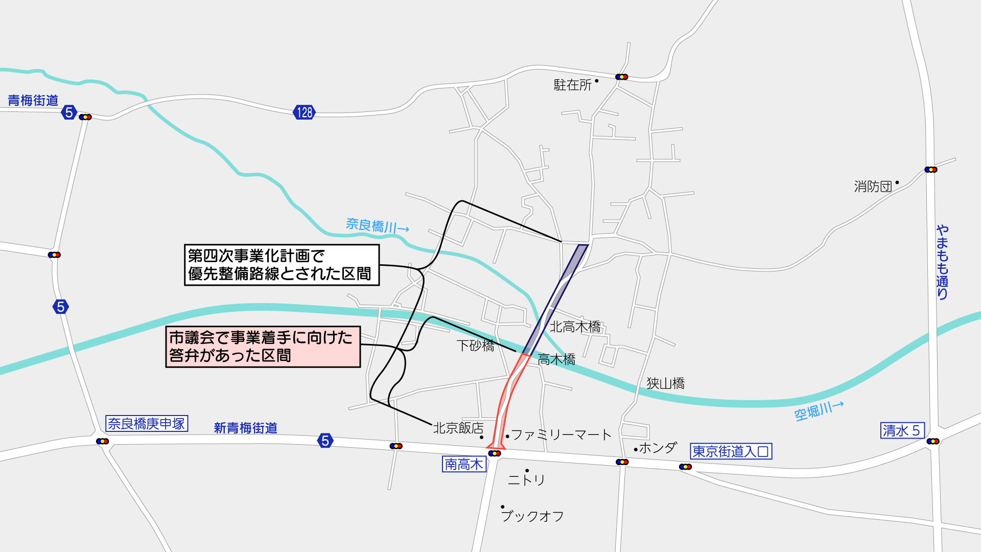 市議会答弁によると、空堀川と交わる高木橋までが事業予定区間のようです。橋の前後どちらまでかはわかりません。
