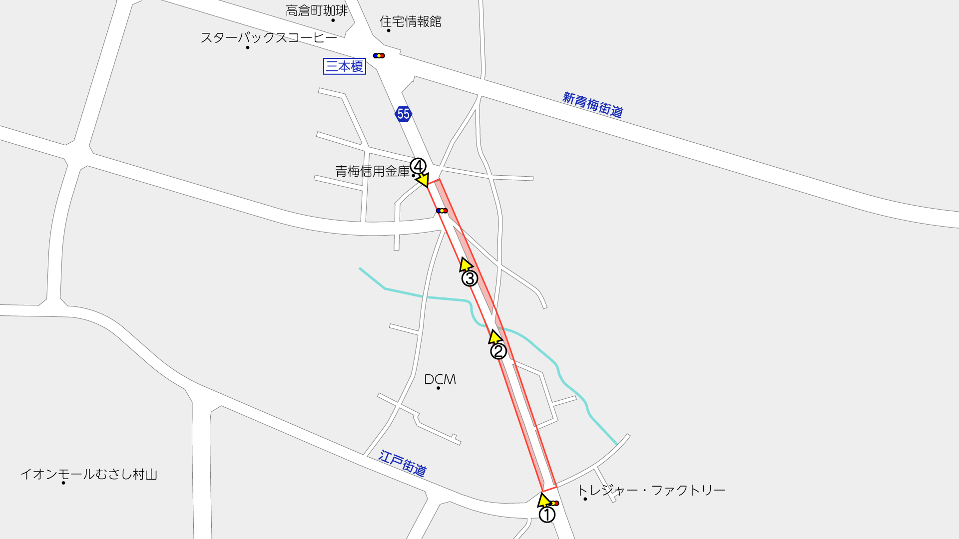 事業区間南側のトレジャーファクトリー前の交差点です。