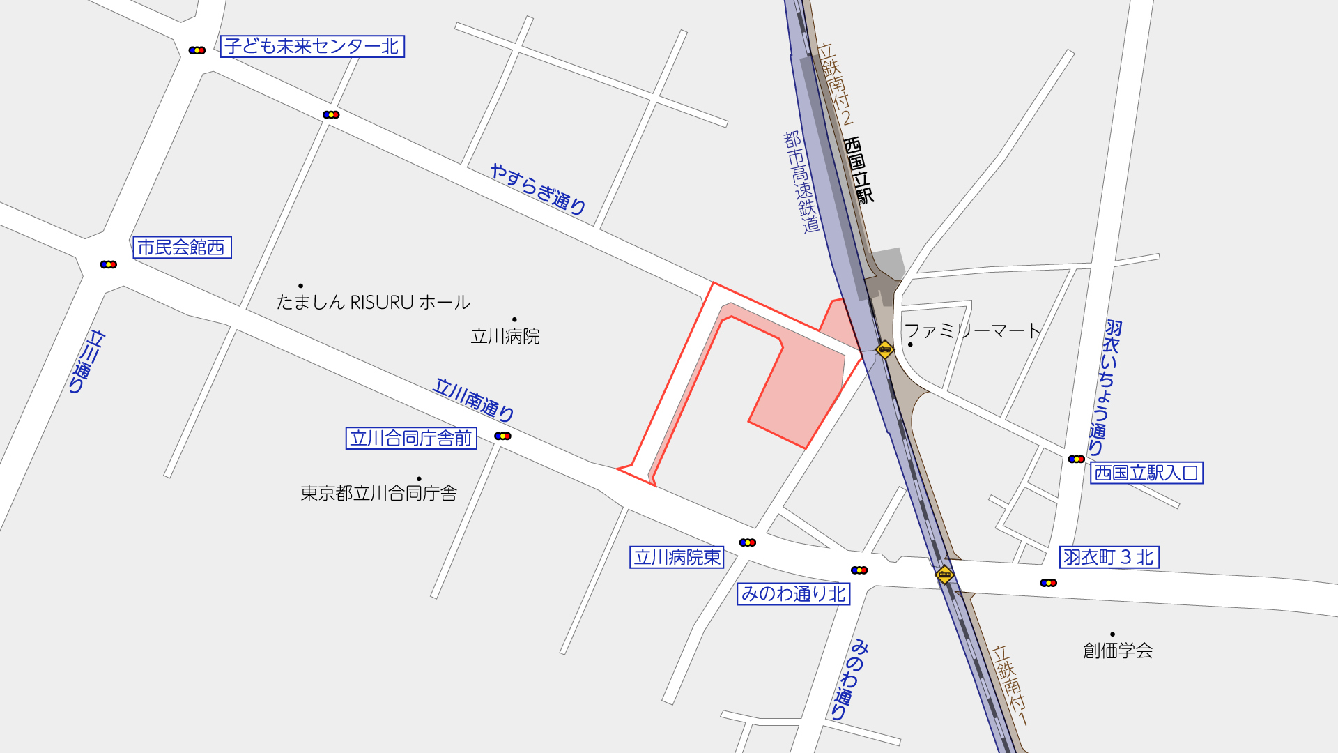 駅前広場の予定地は、建替え前の立川病院などがあった土地で、現在は大部分が国有地(登記簿上では大蔵省)となっています。