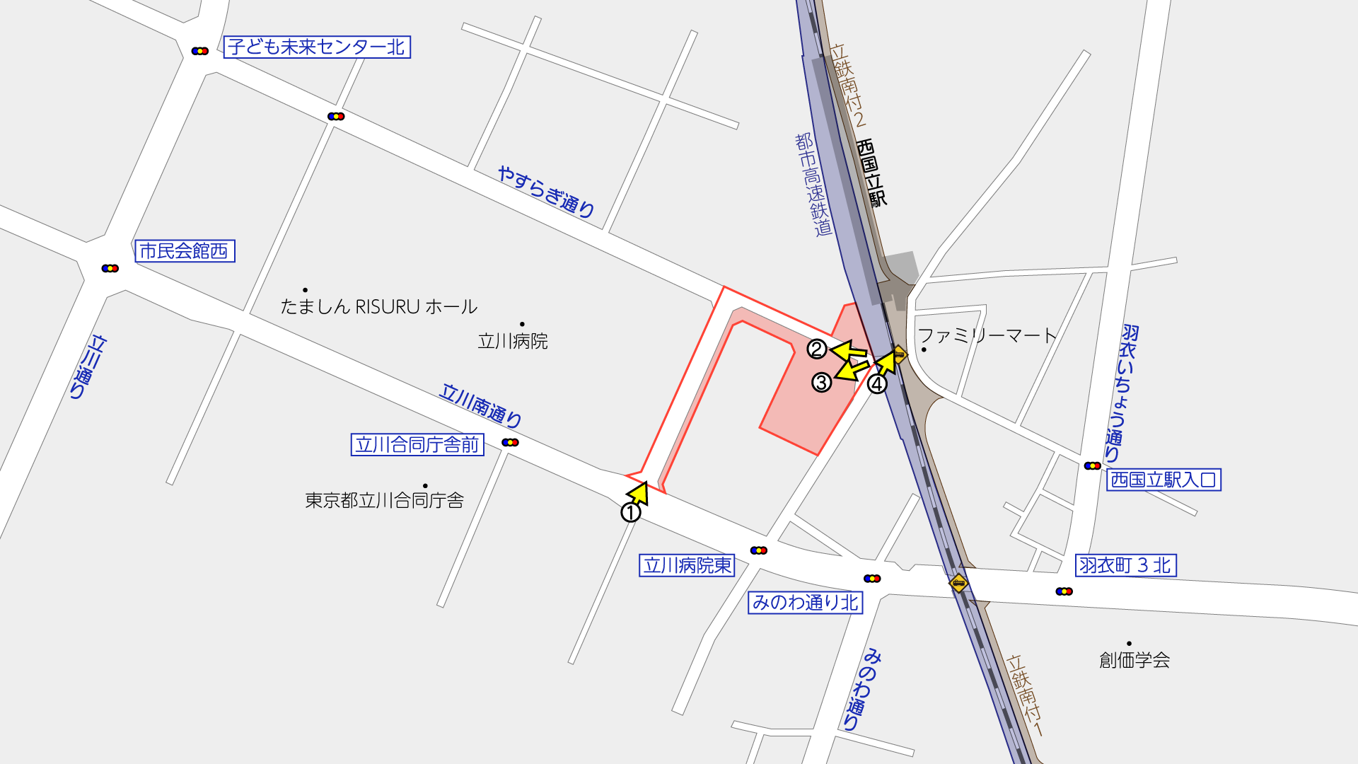 交通広場は、西国立駅横の駐輪場などの土地の一部も範囲に含まれています。
