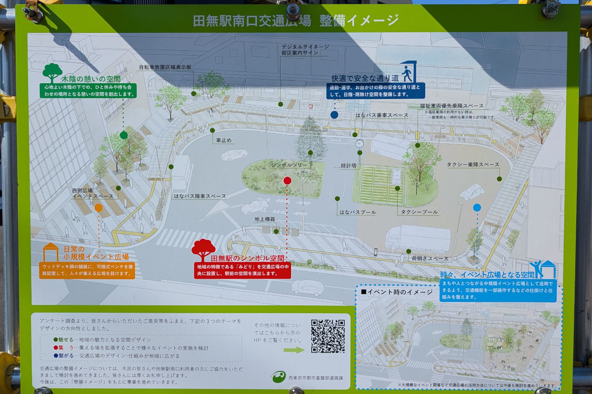 西東京3・4・24号田無駅南口線は西東京市南町五丁目から西東京市新町三丁目に至る延長約1,330mの都市計画道路です。このうち、上記で示した田無駅南口交通広場では、交通広場を新設する事業が行われています。