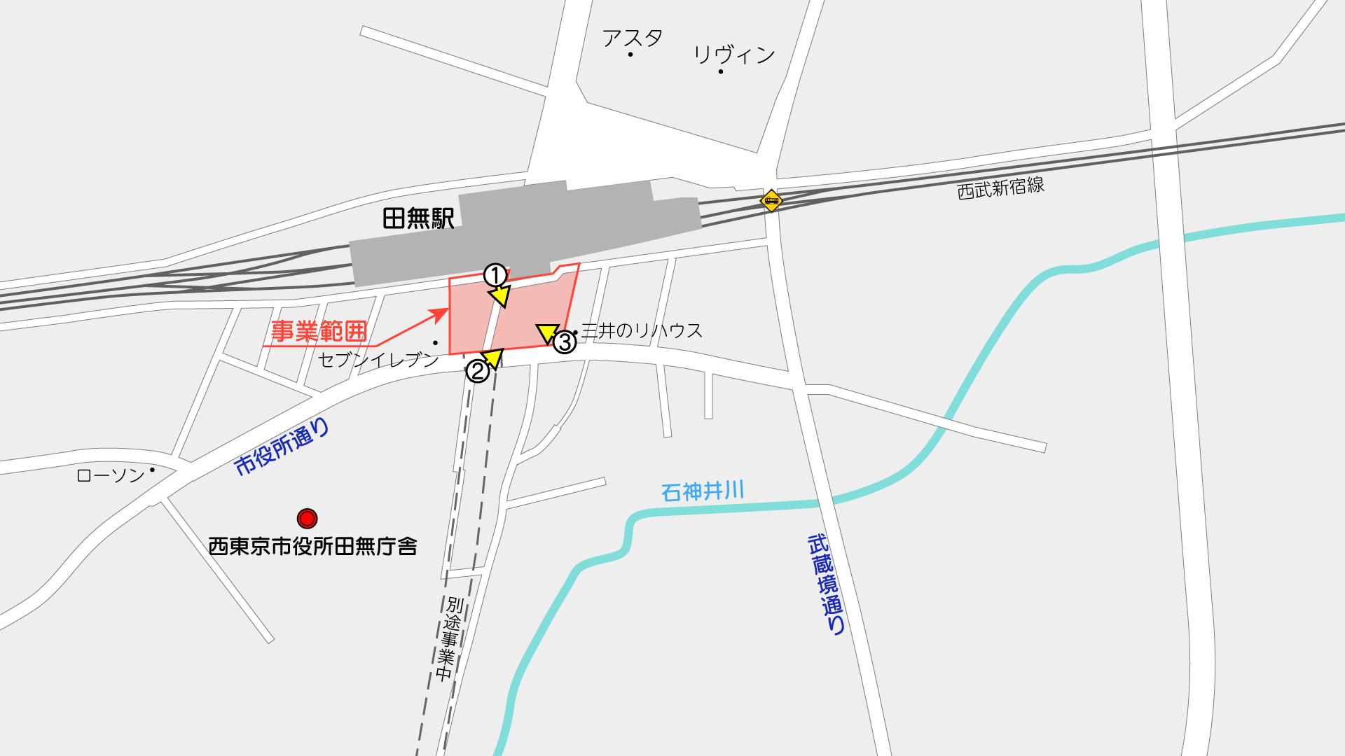 西東京3・4・24号田無駅南口線は西東京市南町五丁目から西東京市新町三丁目に至る延長約1,330mの都市計画道路です。このうち、上記で示した田無駅南口交通広場では、交通広場を新設する事業が行われています。