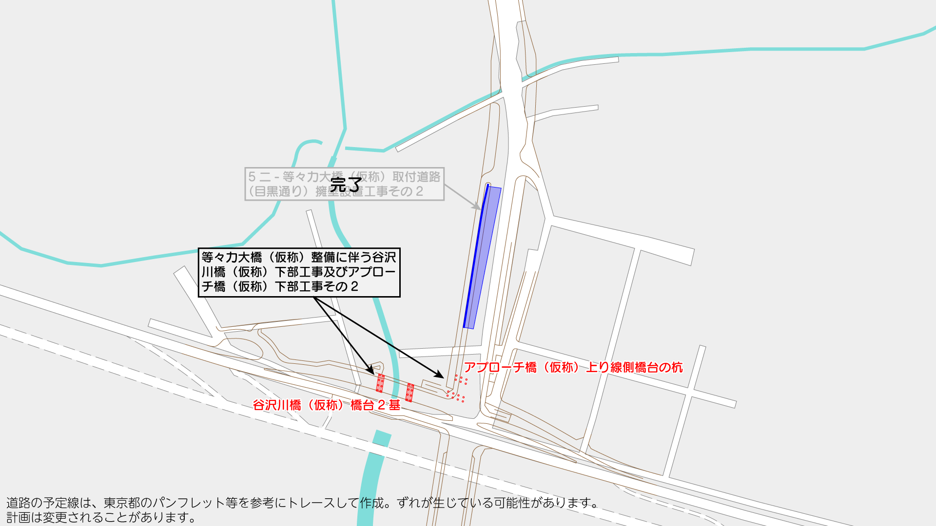 今回建設される谷沢川橋(仮称)は、多摩堤通りの将来丸子橋方面車線となる道路の橋梁と見られます。