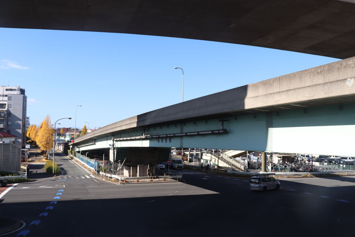 現在の松ノ木島交差点には、東京外環道(中央JCT方面)掘削工事の土砂を運搬するためのベルトコンベア施設が上空を通過しており、そのための橋脚が交差点の真ん中に鎮座しています。