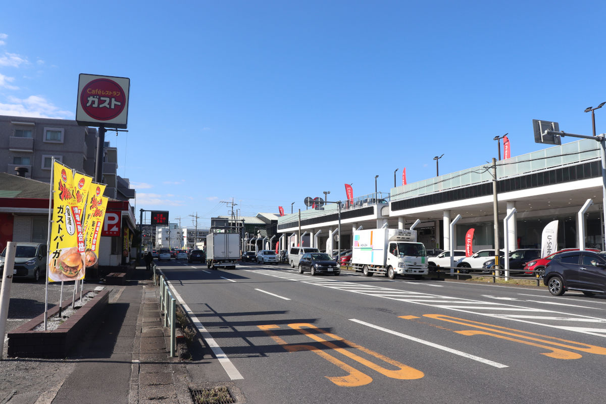 写真右側に拡幅する計画です。沿道には、マクドナルド、ホンダ中古車販売店、2りんかん、中古車販売店などの商業施設が立地しています。