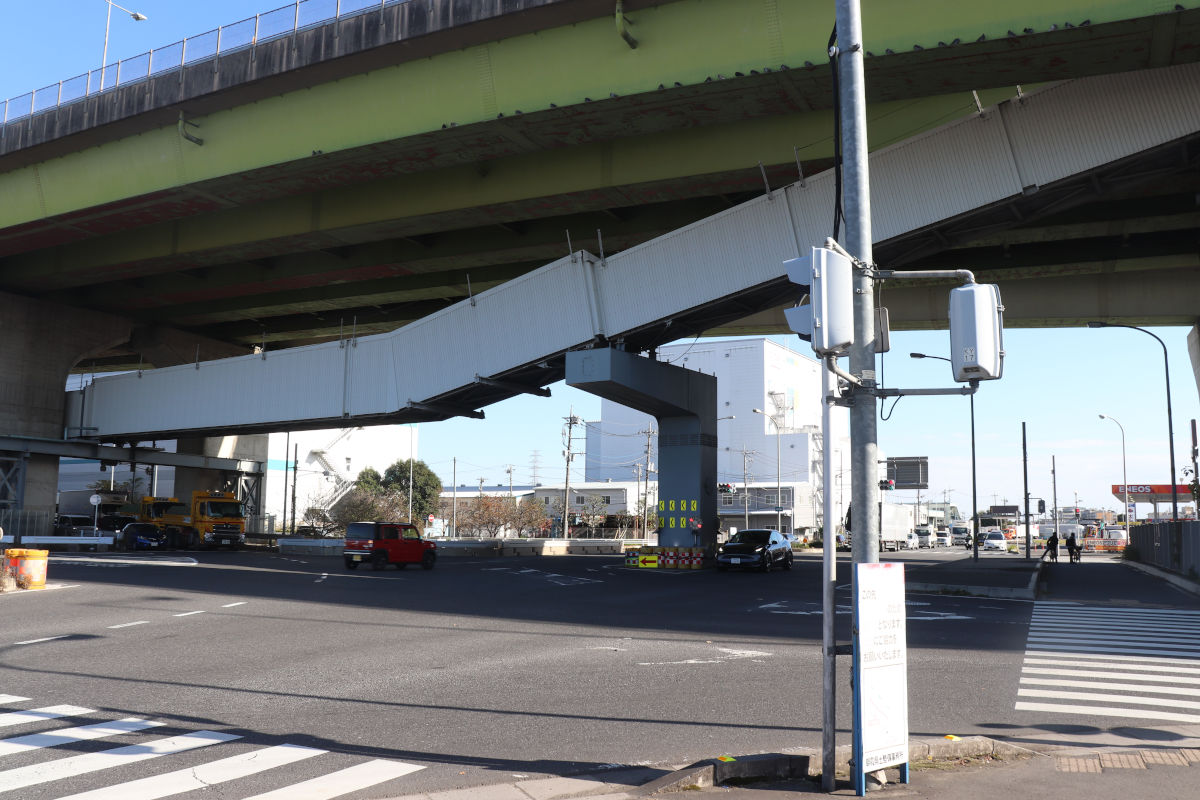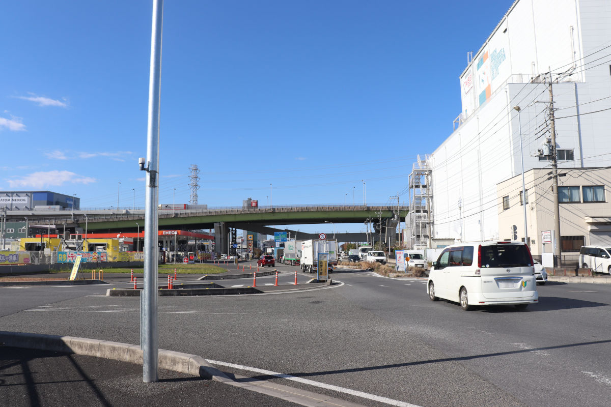 高島陸橋は2車線(片側1車線)です。この交差点を高島通り方向に直進往来する交通量はそれほど多くはないような印象です。