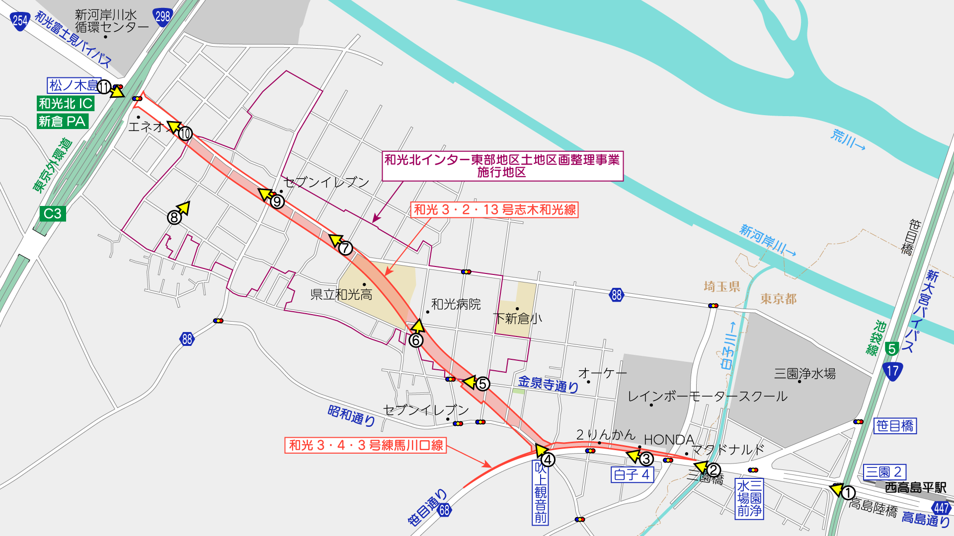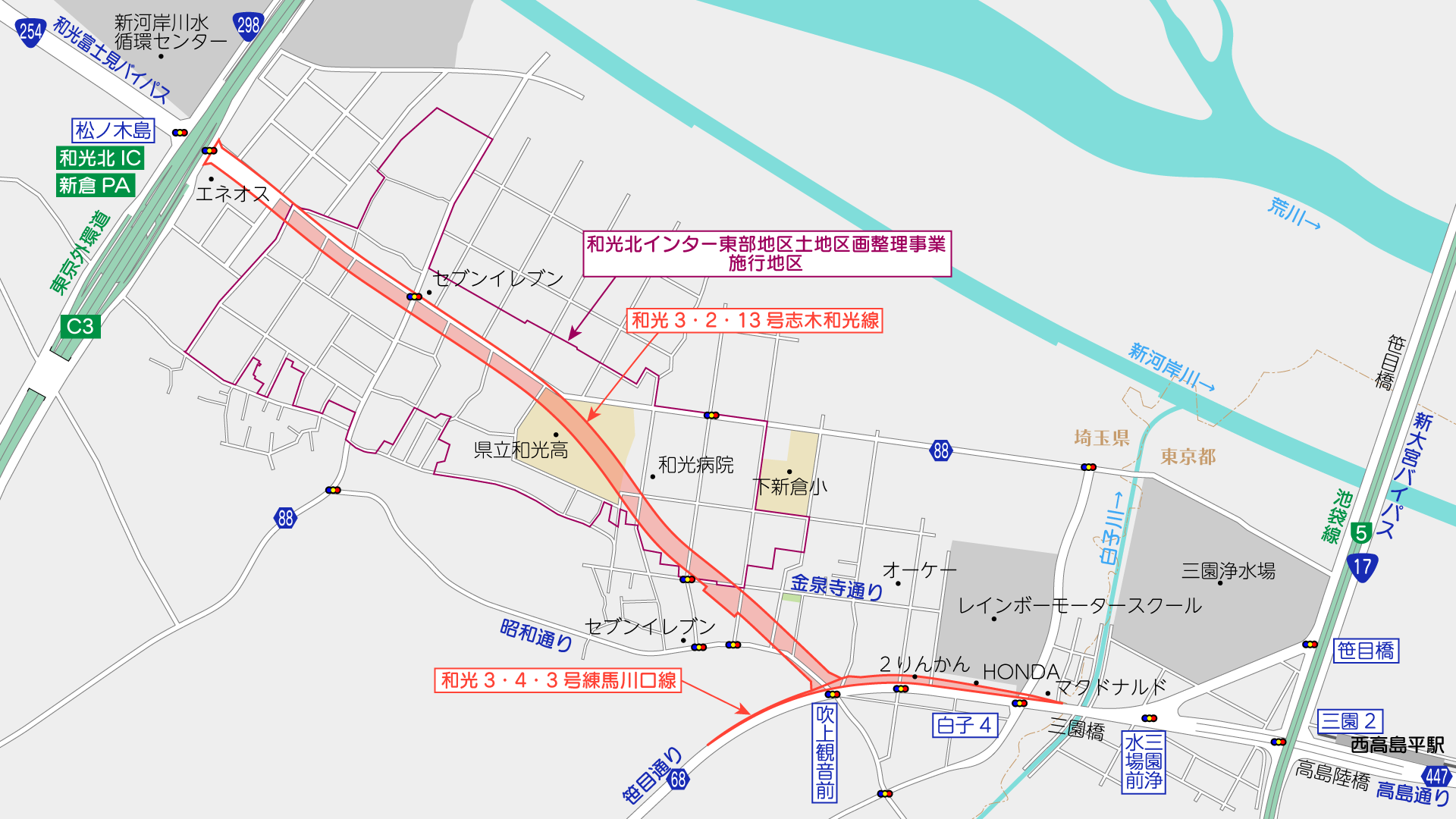東京外かく環状道路(一般道)298と交差する松ノ木島交差点付近南側は、和光北インター地域土地区画整理事業により整備され、同事業で道路用地が確保されています。交差点付近は道路拡幅済みです。